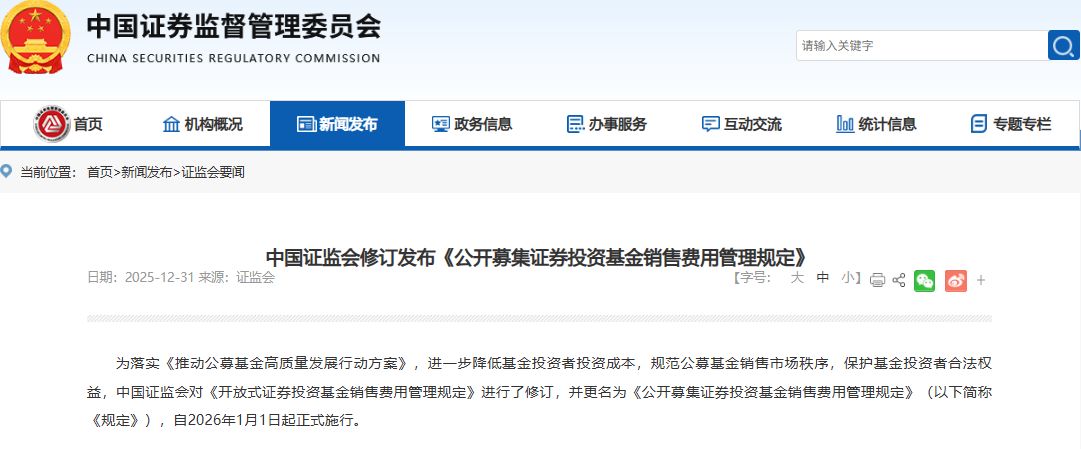 每经编辑|赵云 据证监会官网12月31日消息,为落实《推动公募基金高质量发展行动方案》,进一步降低基金投资者投资成本,规范公募基金销售市场秩序,保护基金投资者合法权益,中国证监会对《开放式证券投资基金销售费用管理规定》进行了修订,并更名为《公开募集证券投资基金销售费用管理规定》(以下简称《规定》),自2026年1月1日起正式施行。