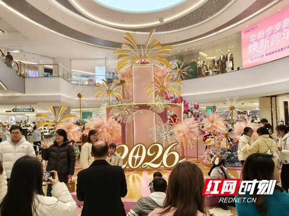 市民在烟花树下拍照打卡。 红网时刻新闻12月31日讯(记者 王新凤 实习生 全金秀 高爽)2025年12月31日下午,衡阳街头处处洋溢着浓郁的喜庆气氛。在元旦前夕,全市各大商圈装扮一新,吸引众多市民走出家门,逛街、打卡、参与活动,以热情洋溢的姿态迎接2026年的到来。