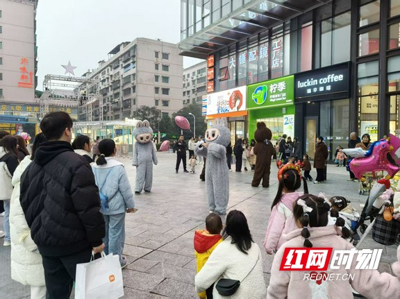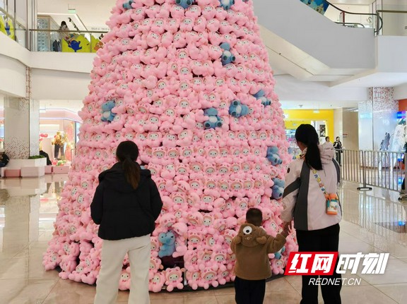 年轻人在以“衡阳星星报”为创意设计的拍照墙前停留。 与此同时,弘阳广场也沉浸在一片热闹与温馨之中。广场外,工作人员身着可爱的Labubu玩偶服,正在与过往的市民亲切互动、合影,引来阵阵欢笑。走进广场内部,一棵高达6米的巨型童梦心愿树尤为引人注目,树下聚集了不少驻足拍照打卡的市民,成为一道温暖的风景线。广场内外,“梦幻奇妙季”主题布景随处可见,小吃街更是人头攒动,充满了热闹的市井气息与浓厚的跨年期待。