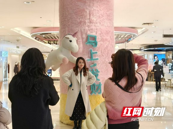 “马上发财”主题装饰柱前聚集了不少正在拍照的市民。