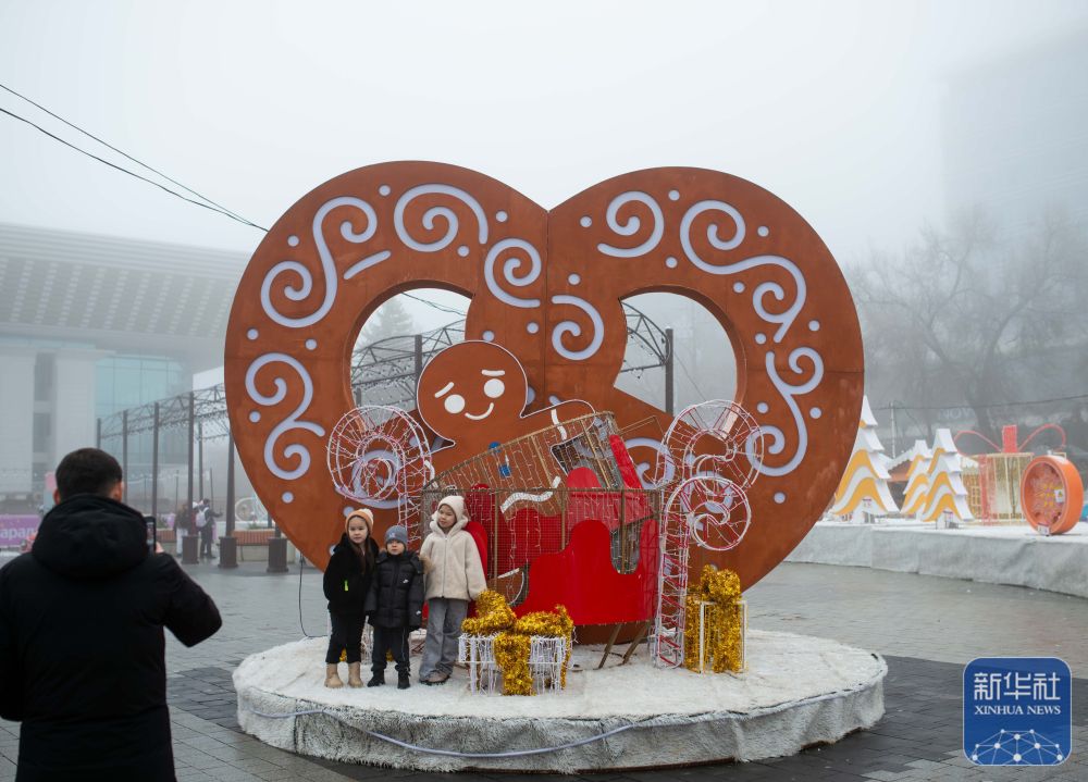 ↑2026年1月1日,在哈萨克斯坦阿拉木图,孩子们在新年艺术装置前留影。新华社记者 李任滋 摄