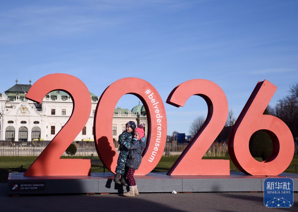 ↑2026年1月1日,在奥地利首都维也纳的美景宫,小朋友在“2026”标识前拍照留念。新华社记者 贺灿铃 摄