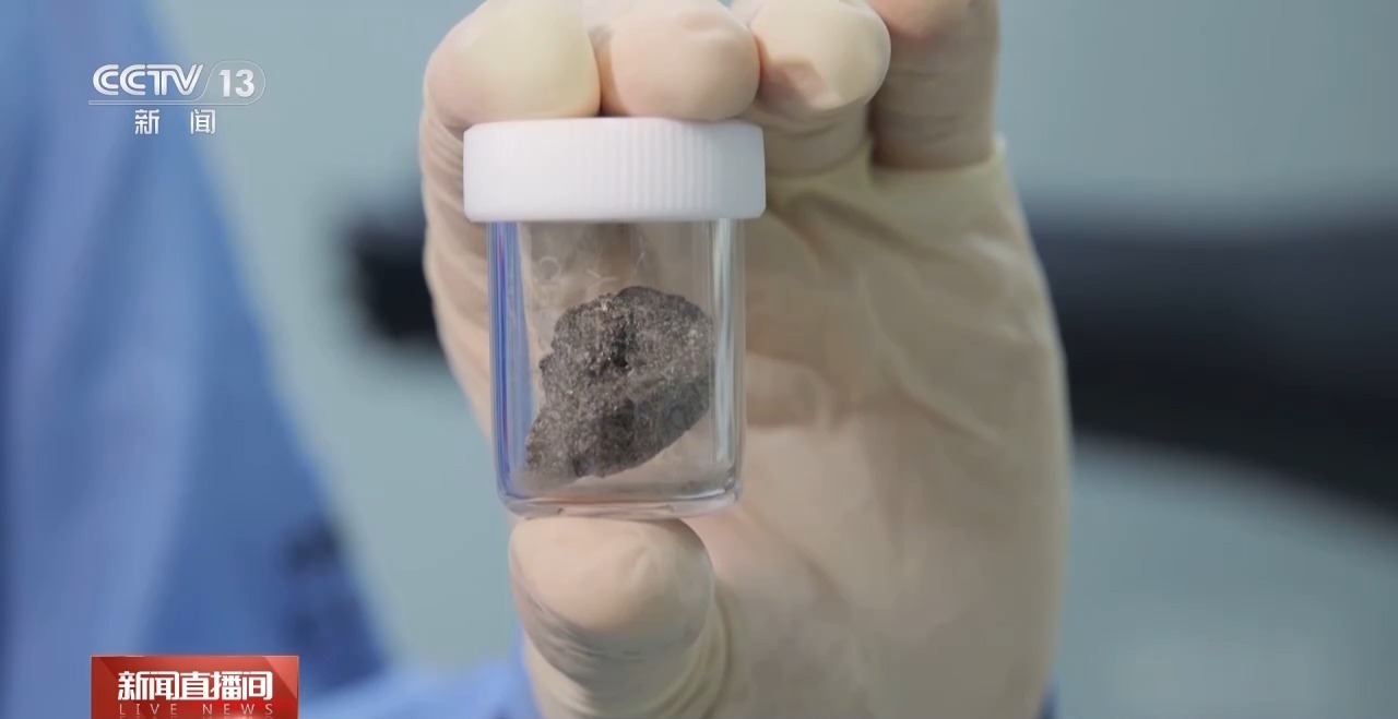 总台央视记者 褚尔嘉:现在我手上的就是嫦娥六号采集回的月球样品,它的重量达到了9克左右,它也是迄今为止我们人类从月球背面采集到的最大的一块玄武岩样品。