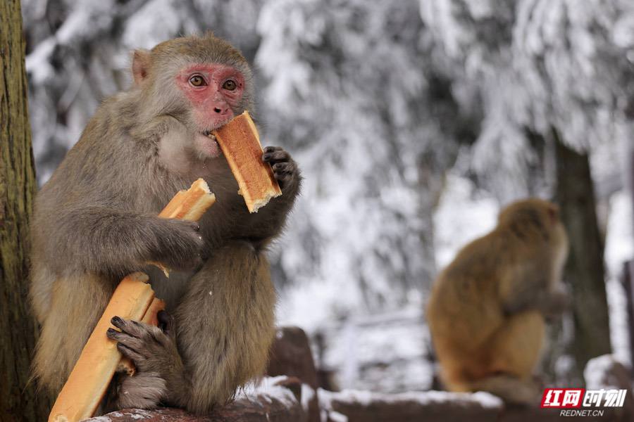 野生猕猴嬉戏觅食。 在黄石寨景区,皑皑白雪与苍翠林木形成鲜明对比,石峰群被冰雪雕琢得晶莹剔透。游客们漫步于雪道,纷纷举起相机记录这难得的美景,欢声笑语回荡在峰林之间。