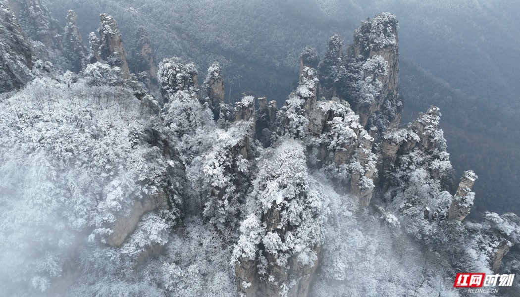 1月2日,连续降雪后的张家界武陵源景区化身为壮丽的冰雪童话世界。