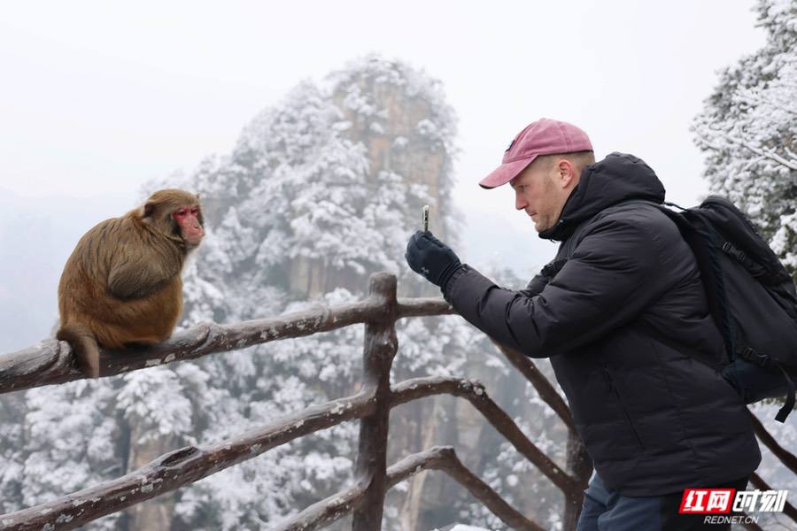 外国游客与野生猕猴互动。 红网时刻新闻1月2日讯(记者 何超 通讯员 张洪涛 吴勇兵)1月2日,连续降雪后的张家界武陵源景区化身为壮丽的冰雪童话世界。张家界国家森林公园内的天子山、黄石寨等核心景区银装素裹,玉树琼枝,独特的“峰林冰雪”奇观吸引了全国各地的游客前来赏雪游玩,体验新年冰雪游的乐趣。