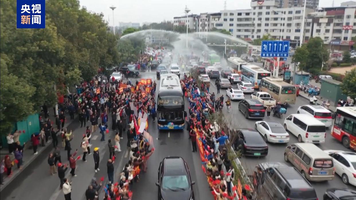 狂欢的热浪,持续涌向永州的每一个角落。本周一,冠军开始前往周边区县巡游。从零陵古城到宁远、新田,每一站都热血沸腾。当永州队车队缓缓驶来,两辆消防车同步开启“过水门”仪式。虽然是工作日,但球迷们都请了假,有的家长还带着孩子专程奔赴这场狂欢。 球迷 赵旖:今天把他们所有的签名都签到了,追星成功。 球迷 全华艳:特别喜欢永州队,尤其是让我的小孩们感染一下这种“永冲锋”的精神。