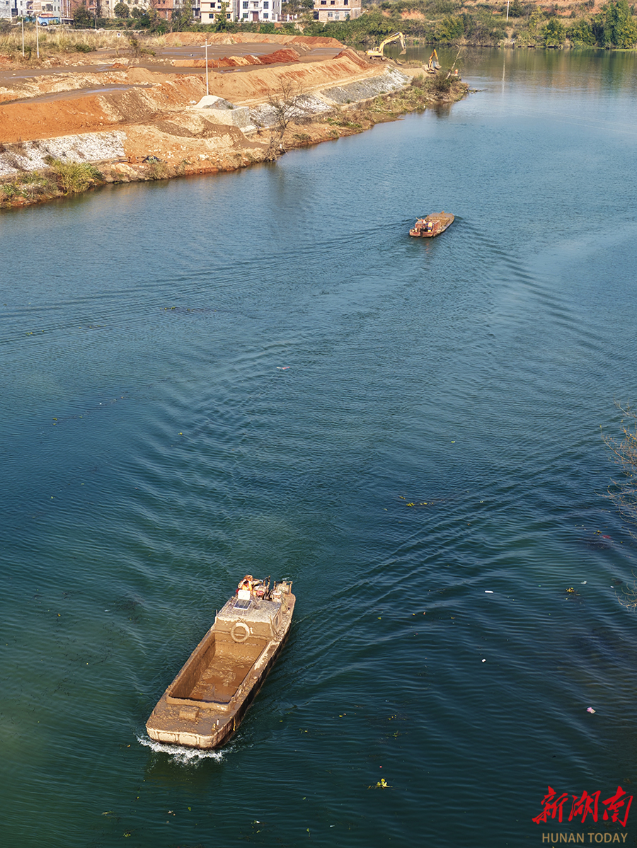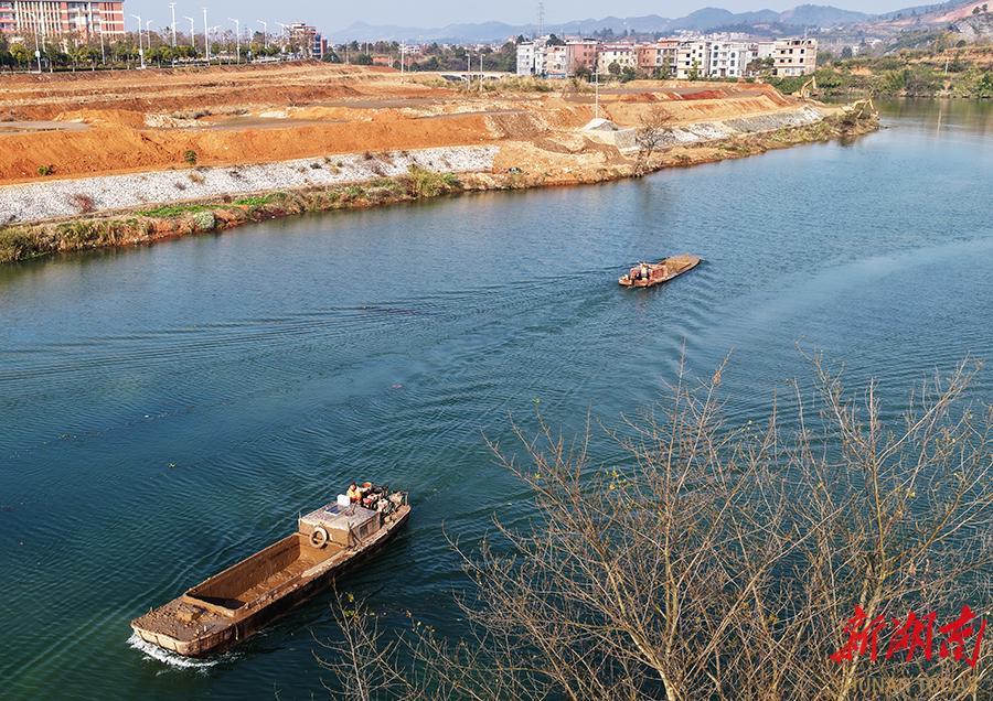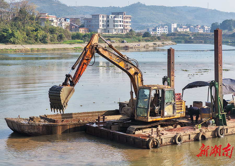 1月3日,嘉禾县钟水河滨江段,施工人员在疏浚河道。元旦假期,该项目施工人员抢抓时间开展河道疏浚,全力推进治理进度,确保早日完工。 黄春涛 摄(湖南图片库)