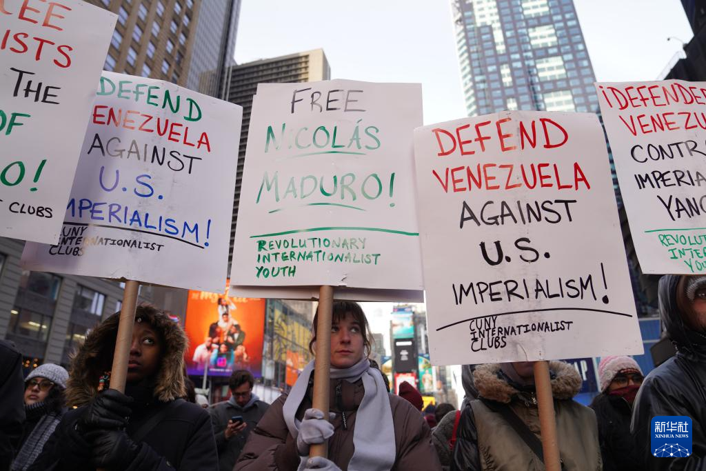 1月3日,在美国纽约,民众参加抗议集会。新华社记者 张凤国 摄 组织方发表声明说,美国发动的战争将给委内瑞拉人民带来死亡和毁灭。美国战争机器消耗大量纳税款,而工薪家庭却在为生计苦苦挣扎。美国人民不想要另一场战争,对美国向委内瑞拉发动的战争说“不”。 3日下午,在纽约时报广场,示威者高举委内瑞拉国旗,手持写着“保卫委内瑞拉,释放马杜罗”“不要插手委内瑞拉事务”“美国滚出加勒比”“反对向委内瑞拉开战”“特朗普必须下台”等标语的横幅,并高喊口号。