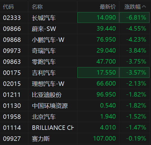 格隆汇1月5日|港股汽车股集体下跌 ,其中,长城汽车(601633)跌近7%,蔚来汽车、小鹏汽车跌超4.2%,奇瑞汽车、零跑汽车、吉利汽车跌近4%,理想汽车、比亚迪(002594)股份、赛力斯均有跌幅。