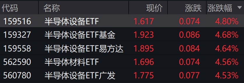 每经记者|叶峰 每经编辑|肖芮冬 半导体设备概念股走强,中微公司涨超13%,拓荆科技涨超5%,中科飞测涨超4%。 受重仓股上涨影响,半导体设备相关ETF涨超4%。