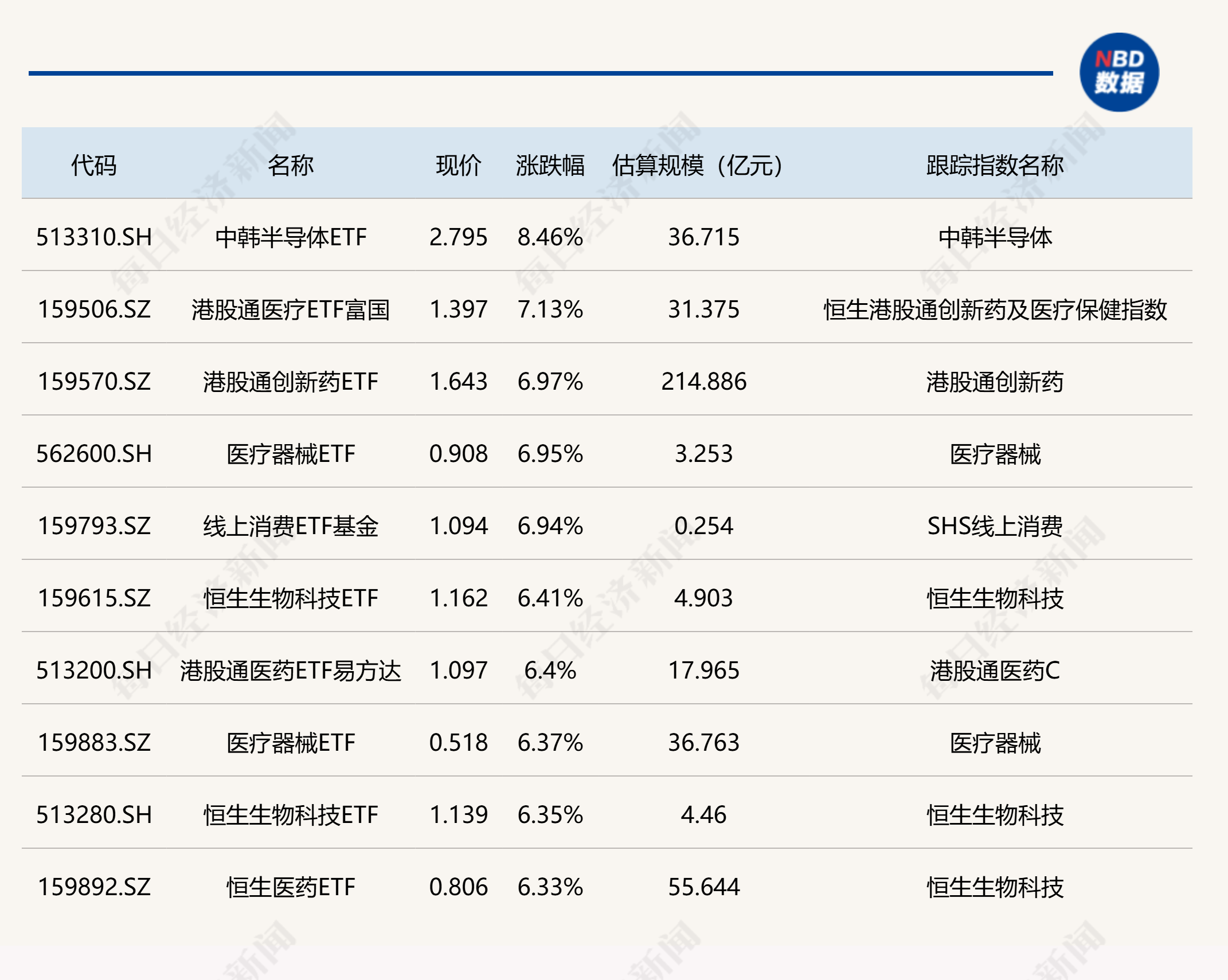 消息面上,国家药监局日前组织制订《优先审批高端医疗器械目录(2025版)》,将医用电子加速器、植入式脑机接口医疗器械、内窥镜手术控制系统等纳入其中。另外,马斯克近日在社交媒体上表示,其脑机接口公司“神经连接”将于2026年开始对脑机接口设备进行“大规模生产”,并转向“更加精简和几乎完全自动化的外科手术流程”。 有券商表示,将植入式脑机接口医疗器械等8类高端产品纳入优先审批范围,进一步凸显政策对相关技术发展的支持力度。脑机接口赛道具备多元化的应用场景与丰富的研发路径,未来潜在市场空间广阔,叠加产品注册与医保立项等政策支持,商业化进程有望加速。 下跌方面,旅游ETF跌逾1%。