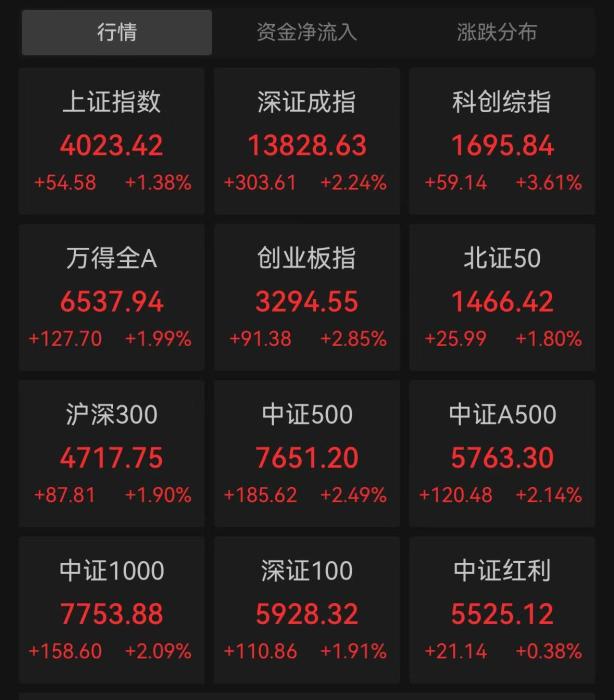 01月5日,2026年首个交易日,A股三大股指集体上涨,沪指重返4000点上方。截至收盘,沪指涨1.38%报4023.42点,深成指涨2.24%报13828.63点,创业板指涨2.85%报3294.55点。全市场超4100只个股上涨,市场全天成交额约2.57 ...