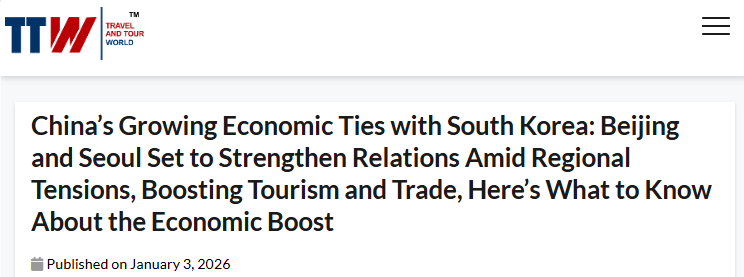 中国日报网1月5日电 近年来,中韩两国持续深化务实合作。从签证优化政策落地带动人员往来加速回暖,到韩国品牌加速开拓中国市场布局,一系列积极举措的不断推进,为两国关系发展注入新动力,也为地区和平与繁荣增添新活力。 互免签证政策助力 双向旅游热度攀升 据《旅行与旅游世界》(Travel and Tour world)网站3日报道,韩国游客正蜂拥前往中国,从北京的长城、故宫到上海的活力街区,丰富旅游资源为韩国游客带来多元体验。而韩国作为中国游客热门目的地之一,首尔、济州岛、釜山等城市凭借多样的文化遗产与现代购物体验,吸引众多中国游客。