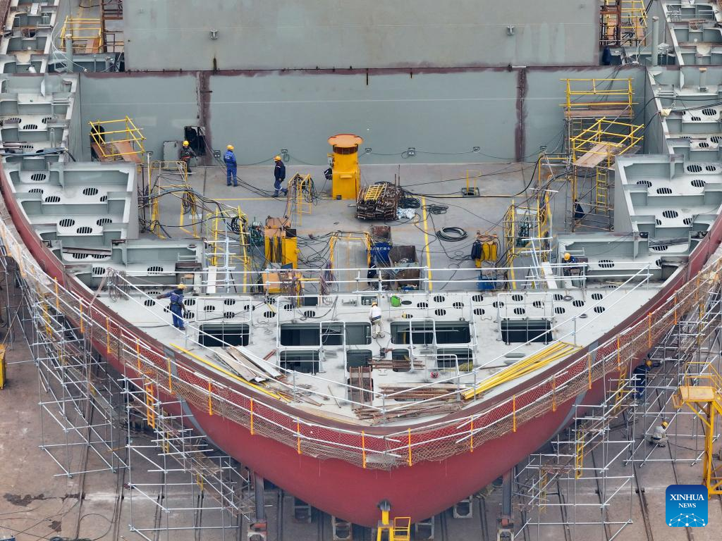 A drone photo taken on Jan. 4, 2026 shows staff members checking the quality of a part of a ship at a shipyard in Yantai, east China's Shandong Province. (Photo by Tang Ke/Xinhua)