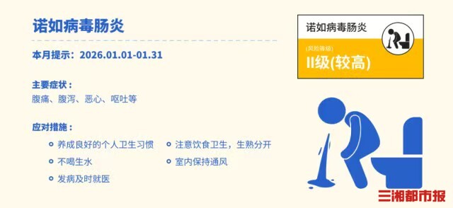 1月6日,记者从湖南省疾病预防控制中心了解到,该中心已经发布2026年1月疾病风险预报,全省防疫指数升至Ⅱ级(较高)。 据介绍,本月湖南需重点关注诺如病毒肠炎与流行性感冒等急性呼吸道传染病,其中诺如病毒感染风险尤为突出。随着寒冷季节持续,湖南疾控提醒公众需强化个人卫生,注意饮食安全,并做好疫苗接种等综合防护措施,以应对冬季高发的肠道与呼吸道疾病风险。 一、诺如病毒肠炎 防疫指数:Ⅱ级(较高) 主要症状:腹痛、腹泻、恶心、呕吐等 应对措施:养成良好的个人卫生习惯;注意饮食卫生,生熟分开;不喝生水;室内保持通风;发病及时就医。 感染诺如病毒传播的方式多样,主要通过摄入被粪便或呕吐物污染的食物或水、接触患者粪便或呕吐物、吸入呕吐时产生的气溶胶,以及间接接触被粪便或呕吐物污染的物品和环境等感染。学校、托幼机构等人群聚集场所是诺如病毒胃肠炎高发场所,需要特别提高警惕。