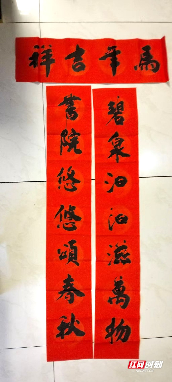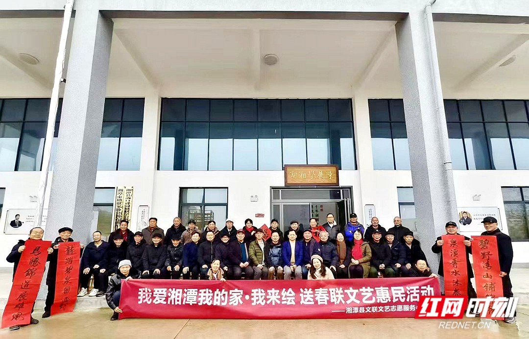 为传承和弘扬中华民族优秀传统文化,营造欢乐、祥和、喜庆的节日氛围,1月4日,湘潭县文联、洛口诗词楹联学会到锦石乡碧泉村,开展“我爱湘潭我的家·我来绘”送春联文艺惠民活动。湘潭市楹联家协会党支部书记舒良才、常务副主席田学荣,湘潭县文联副主席唐定伟,湘潭县老年书协主席谢乔泉,湘潭县洛口诗词楹联学会主席杨孟雄等50余位书法家和楹联家现场为碧泉村创作和书写春联。 室外寒风凛冽,室内人气沸腾。活动现场,书法家们铺好宣纸,蘸饱墨汁,凝神聚气,挥毫泼墨,用行书、楷书等各种字体,在红彤彤的纸上,写下苍劲有力、形式多样、酣畅淋漓、潇洒自如的春联。“碧野青山铺锦绣,泉溪秀水沐春风”“龙耀碧泉自留影,马腾锦道展雄风”“碧泉汨汨滋万物,书院悠悠颂春秋”等饱含美好期许的语句在笔下诞生。