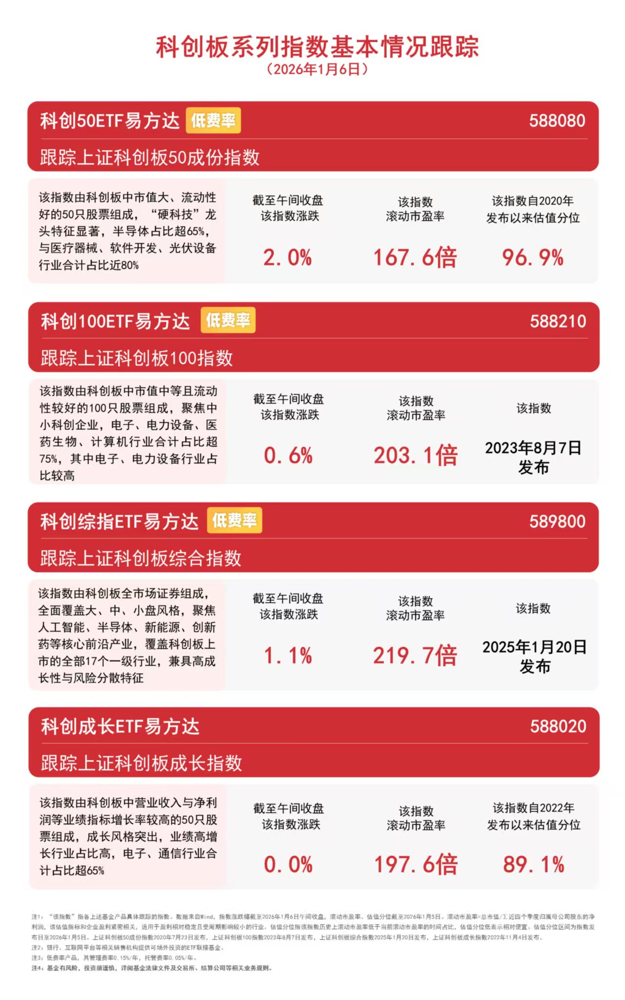 0今日早盘,半导体设备、集成电路等板块走强,科创板局部活跃。截至午间收盘,科创50指数上涨2.0%,科创综指上涨1.1%,科创100指数上涨0.6%,科创成长指数上涨0.01%,科创50ETF易方达(588080)半日成交额超13亿元, ...