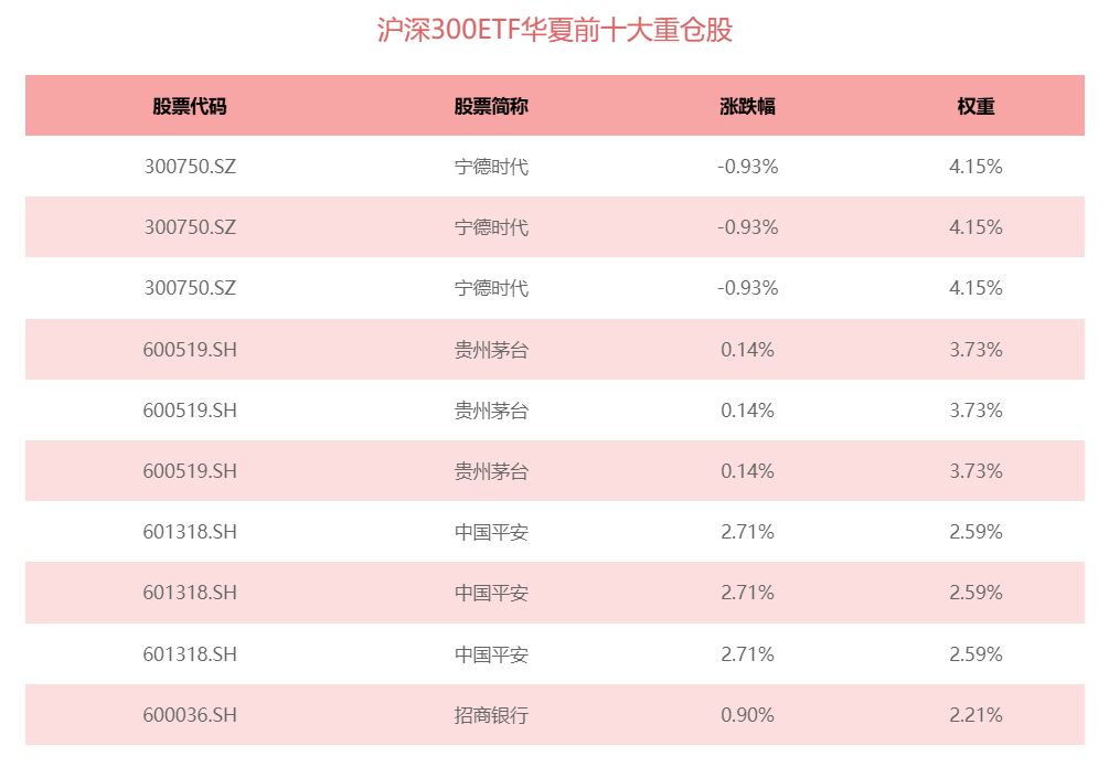 截至1月6日,沪深300ETF华夏(510330.SH)近半年累计涨幅20.33%。沪深300ETF华夏(510330.SH)盘中二级市场价格冲高至4.991元,创近三年以来新高。 从估值层面来看,沪深300指数最新市盈率(PE-TTM)仅14.33倍,处于近10年88.14%的分位,即估值低于近10年11.86%以上的时间。 按申万一级行业分类,沪深300ETF华夏(510330.SH)跟踪的指数权重集中于银行(117.49%)、电子(111.16%)、非银金融(89.28%)、电力设备(79.48%)、食品饮料(65.85%)等板块。按申万二级行业分类,沪深300ETF华夏跟踪的指数权重集中于半导体(62.73%)、证券Ⅱ(54.97%)、股份制银行Ⅱ(53.92%)、白酒Ⅱ(52.73%)、电池(44.33%)等板块。 目前沪深300ETF华夏(510330.SH)费率为全市场同类标的最低,管理费率为0.15%/年。