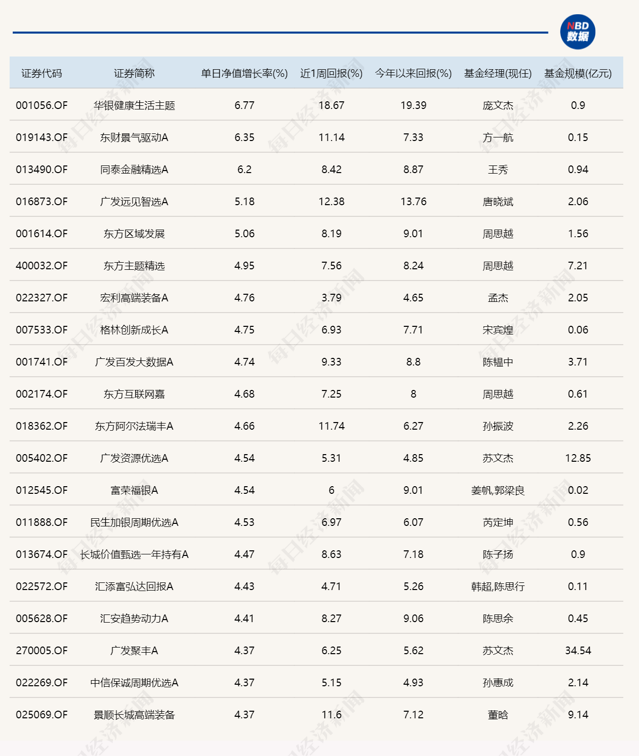 每经记者|肖芮冬 每经编辑|赵云 1月6日,三大指数集体收涨,沪指高开高走,再创十年新高。板块来看,商业航天概念持续爆发,脑机接口概念延续强势,大金融板块集体拉升,化工板块走高。全市场超4100只个股上涨。沪深两市成交额2.81万亿元,较上一个交易日放量2602亿元。 下面一起来看今天公募基金的表现。 (注:榜单1、榜单2仅选取灵活配置型、偏股混合型和普通股票型三类产品作为主动基金的代表,纳入统计;债基相关榜单包括各类主、被动债券型基金) 1.单日涨幅榜
