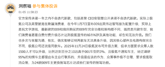 也因此,在国内车企竞争激烈的大环境下,极氪接连推出了至少两轮“购置税兜底”方案,均说明只要完成锁单,就可享受上万元的购车尾款抵扣。 然而,2025年12月下旬开始,形势突然反转。多位车主反映,极氪销售开始集中联系他们,要求在未验车、未知车辆是否符合交付条件的情况下,于2025年底前支付尾款以配合提前开票,否则将无法享受购置税兜底政策。 “新车我都没看到,就让我交尾款?是怕到2026年补贴购置税吗?那当初的兜底方案算什么?”,车主们表示无法接受销售的提议。 车主李飞(化名)直言,自己在看到极氪官方此前承诺购置税兜底后,在2025年12月30日支付了定金锁单,而到了12月31日,销售告诉他车辆已经下线了,但是他在极氪App上未看到生产和运输状态。销售承诺当天付款可以在2026年开票,并享受购置税兜底政策。但在付款后,到1月2日下午,极氪销售却表示不能进行购置税兜底,只能给3万极氪App内的消费积分(大约等于人民币3000元,而车辆购置税大约在1.1万元)。 类似这种情况的车主不在少数,他们购买的车型覆盖了极氪001到极氪7X等多款热门车型,车辆价格普遍在20万元以上,因为此次事件,车主组成了“韭菜群”希望向官方争取最初的承诺。 《次世代车研所》栏目就上述情况向极氪官方进行求证,截至发稿,官方暂无回应。之后,《次世代车研所》又致电李飞购车门店,对方表示李飞的问题已经解决,但未透露具体解决方案。 据另一些车主透露,目前官方给出的回应是可以将积分补偿提升到与车辆购置税相等额的积分,但这一方案并未获得全体车主认可。“App积分只能在官方渠道使用,限制太多,我们要的是当初承诺的购置税兜底,而不是这种变相的‘代金券’。” 但是,另有知情人士向《次世代车研所》表示,极氪也并非此次事件完全责任方。一些车主在与极氪销售沟通时,希望提车时间可以延迟到2026年1月,“他们既想拿极氪的补贴,又想拿地方国补”,而极氪兜底政策的改变让他们的“算盘落空”。 纠纷叠加:改款背刺,智驾承诺落空 在购置税兜底风波之外,近期在黑猫投诉 【下载黑猫投诉客户端】平台上,不少极氪009车主集体投诉新车“背刺”事件。