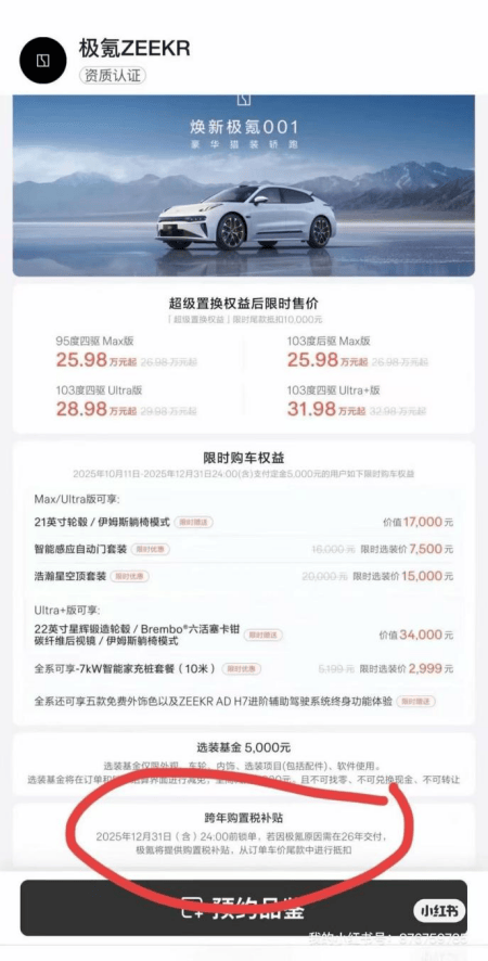 0文|《次世代车研所》栏目 罗宁根据相关政策,自2026年1月1日起,新能源汽车购置税政策迎来重大调整,从全免变为减半征收(按5%税率)。在去年下半年,极氪就上线了一个“跨年购置税补贴”,称只要在2025年12月31日24 ...