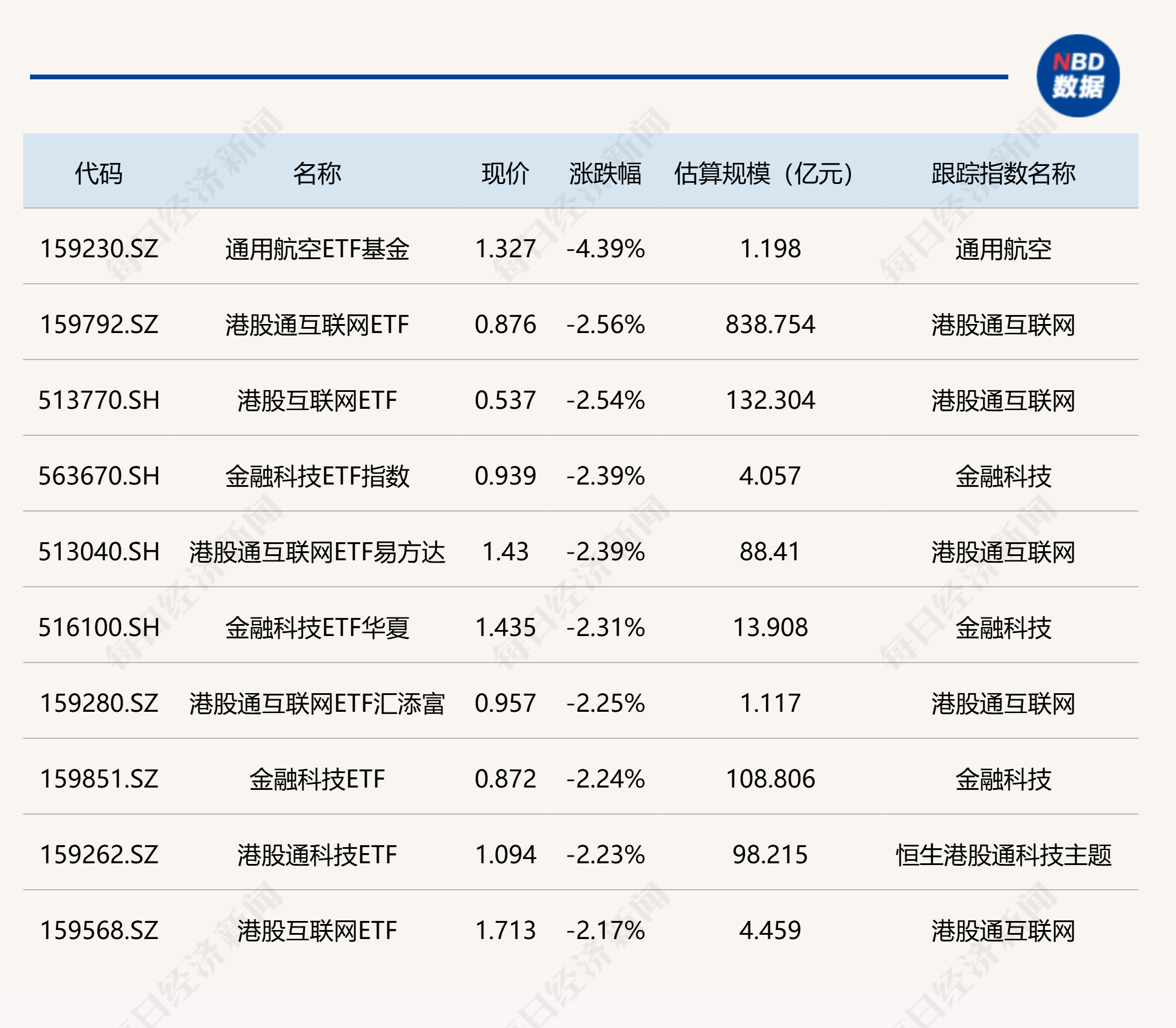 有分析表示,在AI浪潮和国产化大背景下,国内先进产线未来扩产需求持续存在,半导体设备作为晶圆代工扩张的基石,同时是实现产业链自主可控的重要环节,国产半导体设备企业有望迎来发展机遇。 下跌方面,通用航空ETF基金跌超4%,港股互联网、金融科技等ETF跌超2%。