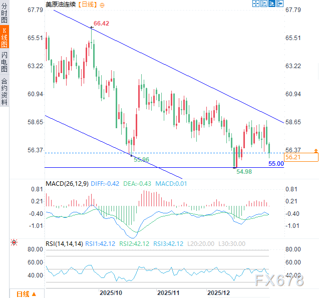 周三(1月7日)亚欧时段,美原油价格震荡下行,延续前一交易日跌势,日内跌幅约1.63%,现交投于每桶56.20美元附近。此前美国总统特朗普透露委内瑞拉将向美国移交3000万至5000万桶原油。随着交易员根据新地缘政治动态重新调整供应预测,油价承压下行。 ![]() 市场预期转向供应扩张 市场的反应反映出投资者担忧,即美国的做法优先考虑增加石油供应而非限制供应。正如Moomoo ANZ的Tina Teng所指出的,这加剧了全球供应过剩的现状。 与加拉加斯的协议可能会使原本船货转向。尽管雪佛龙是唯一在现行制裁下被授权运输委内瑞拉石油的公司,并保持着运营控制权,但此次涉及的原油数量巨大。雪佛龙目前每日运输10万至15万桶原油,而该协议潜在价值达19亿美元,意味着将向全球市场注入显著的新增供应量。 有市场分析师认为,尽管2026年初的地缘政治头条新闻占据主导,但基础现货市场一直显示出疲软迹象。中东原油品级价格持续下跌,表明买方兴趣不足,并可能暗示地区性供应过剩,进一步削弱了全球原油定价结构。 库存数据或引发市场矛盾情绪 与供应过剩担忧相反,美国石油协会数据显示上周美国原油库存减少277万桶,这为市场提供了短期平衡因素(尽管据报道成品油库存有所增加)。虽然API数据暗示美国国内供应趋紧,但市场预计官方数据将会显示截至1月2日当周原油库存小幅增加。若该预测得到证实,数据差异可能表明报告存在波动性,且近期库存方向存在不确定性。 摩根士丹利预测2026年上半年石油市场可能出现高达每日300万桶的供应过剩,看跌情绪进一步加剧。该预测基于2025年需求增长停滞以及OPEC与非OPEC产油国产量上升的判断。委内瑞拉协议恰逢全球产量攀升之际达成,加剧了市场对供应量将持续超过需求(至少未来两个季度)的担忧。 在市场已疲于应对需求停滞和高库存水平之际,美委石油协议引入了新的供应侧变量。尽管地缘政治动态备受关注,但目前主导价格走向的是基本面因素——即疲弱的需求增长和非OPEC国家产量的上升。除非消费趋势出现实质性转变或产量回调,否则原油市场在短期内可能仍易受进一步下行压力影响。 技术分析 日线图显示,美原油价格长期稳定运行于下行通道中,预示未来看跌倾向或将长期占据主导。 与此同时,14日相对强弱指数(RSI)显著低于中线水平,MACD震荡指标运行于负值区间,进一步强化下行压力。 上行方面,上行通道上轨(59.25)预计构成显著阻力位,若有效突破上行通道上轨,或将扭转短期看跌倾向。 下行方面,55.00美元将构成首道支撑,若油价收盘跌破该水平,可能加速油价下探50.00美元支撑位。 ![]() 北京时间15:02,美原油连续现报56.19美元/桶。
