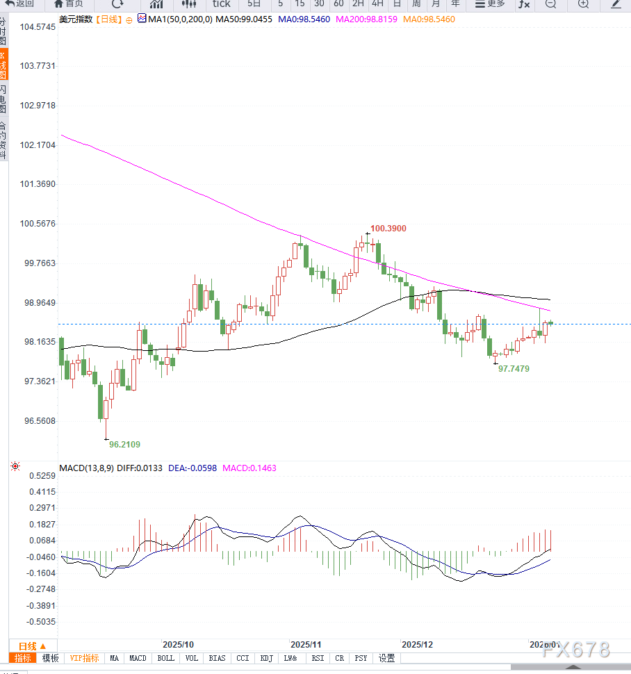 美元指数近期整体维持偏弱运行格局,在短暂反弹后再度陷入横盘整理,显示市场在关键经济数据公布前态度谨慎。 ![]() 尽管近期国际局势依然复杂,美国在委内瑞拉问题上的行动以及多边紧张局势并未明显推升避险情绪,美元作为传统避险资产的吸引力有限,反映出市场当前更关注美国国内经济基本面与货币政策前景。 此外,美联储内部对利率路径的分歧,以及下一任美联储主席人选的不确定性,也在一定程度上削弱了美元的方向性动能。 从政策预期来看,CME集团FedWatch工具显示,美联储在1月27–28日会议上维持利率不变的概率仍处于较高水平,短期内市场尚未完全押注快速降息。 这种“高概率按兵不动、低确定性后续路径”的状态,使得美元指数更容易受到单一经济数据冲击,而非形成趋势性行情。 从美元指数日线图形来看,DXY目前运行于多条中短期均线下方,整体结构仍偏空。日线级别中,指数此前跌破100整数关口后未能有效收复,反弹高点逐步下移,显示上方抛压较为明显。 14日相对强弱指数(RSI)徘徊在中性偏弱区域,尚未出现明显超卖信号,说明下行动能虽有所放缓,但反转条件尚不成熟。 同时,MACD指标仍运行在零轴下方,快慢线维持弱势结构,暗示美元指数短期内仍以震荡偏弱为主。若后续跌破98.00一线支撑,可能进一步打开下行空间;反之,若经济数据意外向好,指数需重新站稳99.00上方,才能改善整体技术形态。 综合来看,在关键经济数据公布前,美元指数缺乏明确驱动因素,短线更可能维持区间波动。就业与服务业数据的表现,将直接影响市场对美联储政策节奏的判断,并成为决定美元下一阶段走势的关键变量。 ![]() 当前美元指数的核心矛盾并不在于地缘风险,而在于美国经济是否出现实质性放缓信号。在政策前景尚未明朗之前,美元更可能通过震荡来消化不确定性。 若后续数据持续走弱,美元的中期下行压力或将逐步显现;反之,若就业和服务业韧性仍存,美元阶段性反弹空间仍不可忽视,但高度可能受限于此前破位形成的技术压力区。