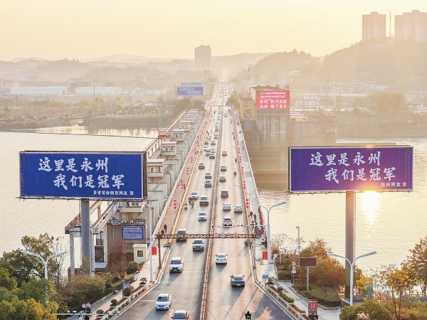 连日来,永州市城区的立柱广告牌、户外电子屏被江苏南京、苏州等地网友“霸屏”,他们登出祝贺永州队夺得湘超冠军的各种祝福语,引发众人关注、点赞。组图为1月7日永州街头即景。湖南日报全媒体记者 郭立亮 通讯员 雷中祥 摄影报道 1月7日,永州市冷水滩区宋家洲大桥桥头,多个统一成蓝底白字样式的大型户外广告,成为一道亮丽的风景线。广告词分别有“这里是永州,我们是冠军”“这里是永州,冠军专属‘州’”……落款是远在千公里之外的江苏南京、苏州、泰州、南通等地的网友和球迷,引发众人关注。 永州队逆袭,感动江苏网友