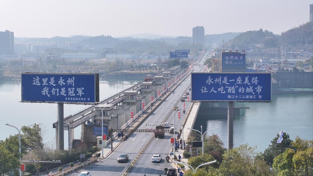 1月7日上午,江苏省广播电视总台的直播镜头前,两名来自江苏昆山、淮安的球迷站在永州市宋家洲大桥上,送上对永州队的祝福,分享在永州市体育场体验“挂票”“砖票”的独特经历。直播期间,有市民闻讯赶到,手提永州美食,请远方的客人品尝。 此前,正是在宋家洲大桥的桥头,第一块“苏籍”祝福广告牌亮相。据来自苏州的封全昌介绍,他看球数十年,但在去年的“苏超”“湘超”都没抢到过票。“湘超”决赛日,他走进永州市体育场,与数万名球迷一道,为远在长沙征战的永州队隔空助威。
