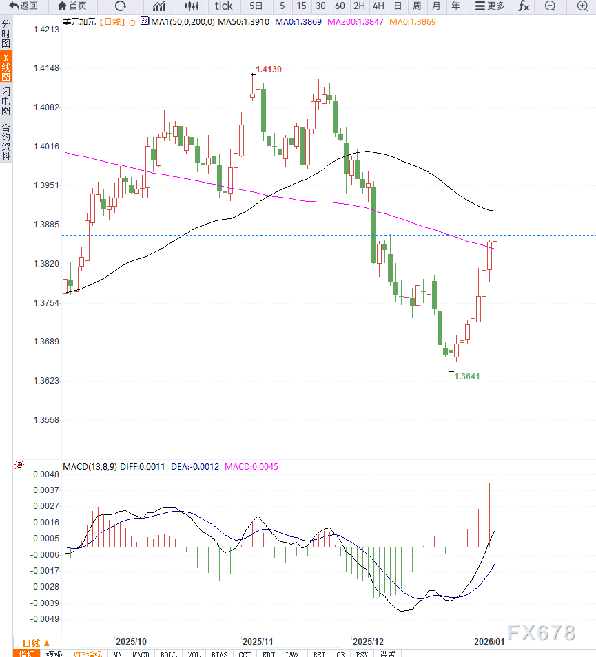 周四亚洲交易时段,美元兑加元(USD/CAD)延续升势,连续第五日上涨,盘中交投于1.3860附近。 ![]() 加拿大总理马克·卡尼表示,即便委内瑞拉原油出口回升,加拿大原油仍具备低风险和较强竞争力。 同时,其办公室透露,卡尼将于1月13日至17日访问亚洲国家,以推动加拿大出口多元化,降低对美国市场的依赖,这在一定程度上缓和了市场对中长期加元前景的担忧。 经济数据方面,加拿大最新公布的Ivey采购经理人指数(PMI)显示,12月指数升至51.9,较11月的48.4明显回升,并高于市场预期的49.5,重新回到扩张区间,表明商业活动有所改善。 市场同时关注即将公布的加拿大10月贸易帐数据,以进一步判断外需变化。 美元方面,整体走势相对平稳。尽管美国经济数据显示出一定韧性,但就业相关指标偏弱,使市场在关键数据公布前保持谨慎。 市场预计,美国12月非农就业人数或增加5.5万人,低于11月的6.4万人,这限制了美元进一步走强的空间。 具体来看,美国12月ISM服务业PMI升至54.4,明显好于前值和预期,显示服务业仍具韧性;而ADP就业数据显示,12月私营部门新增就业4.1万人,略低于市场预期,反映劳动力市场降温趋势仍在延续。 从日线走势来看,美元兑加元延续震荡上行结构,价格稳步运行在主要短期与中期均线之上,显示多头趋势占据主导。 近期连续收阳,表明买盘动能仍较充足。技术指标方面,RSI位于50上方并继续走高,尚未进入超买区,暗示上行空间尚未完全释放。 上方关注1.3900—1.3950区间压力,若有效突破,汇价可能打开新一轮上行空间;下方初步支撑位于1.3750附近,一旦跌破,短线涨势或暂告一段落。 ![]() 整体来看,美元兑加元的持续走强,反映出市场对原油供应预期变化的快速定价。在委内瑞拉原油回归预期尚未被证伪前,加元情绪面仍偏谨慎。 尽管加拿大经济数据出现改善迹象,但短期内仍难以完全抵消外部能源因素带来的压力。若美国非农数据继续走弱,美元涨势或放缓,但在原油不确定性消除前,美元兑加元维持高位震荡偏强的概率仍然较高。