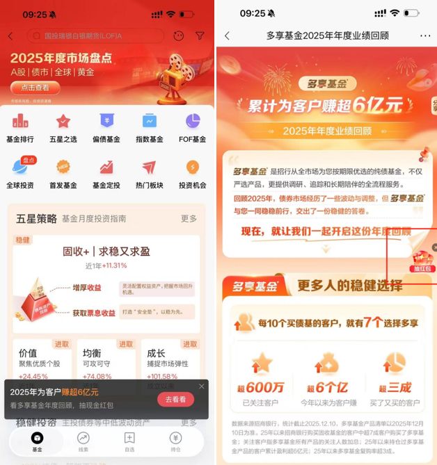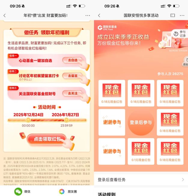 来源:招商银行手机APP 根据介绍,领取福利需要完成三个任务,才有机会领取现金红包。任务包括将心动基金一键加自选、讨论区年初展望留言打卡、关注国联安基金招财号。红包金额并不算大,但参与人次已经多达26277人。 1月8日,有业内人士在同记者交流时表示,类似的方案是合理的,因为是通过任务达成之后间接进行的权益派发,没有直接参与销售基金派发红包等行为。也有人士表示,此类红包并不算大额红包,表示不太关心此类权益的使用。但有观点也认为,实施有奖营销或变相引导投资人购买指定产品,削弱了其选择的自主性。 事实上,针对基金销售机构的业务约束,《公开募集证券投资基金销售机构监督管理办法》已有规定,基金销售机构及其从业人员从事基金销售业务,不得有包含采取抽奖、回扣或者送实物、保险、基金份额等方式销售基金的行为。 那么,平台针对新人客户发放限时福利,比如申购金额满减活动、申购费用上限封顶,类似的营销方案是否与现行规定要求有冲突?再如派发福利及新客券包等形式,是否合规等问题,记者在同天天基金和招商银行相关负责人了解情况时,双方均未做出官方性回复。 行情持续回暖,公募基金年初频频增加销售机构2026年开年以来,A股连续多个交易日上涨,万得全A新年首日上涨1.99%,创下2015年以来最好年度首日表现。买卖双方机构都对跨年以及春季躁动行情充满期待,基金公司的发行也在加速。 Wind统计显示,新年首周(1月5日至11日),全市场共有45只新基金进入募集期(按认购起始日计),不仅创下近12周以来发行数量新高,较前一周增幅更超过4倍,市场活跃度显著攀升。 此外,还有多家基金公司旗下的产品在近期公告提前结束募集。其中,平安港股通均衡配置、华宝中证全指电力公用事业ETF、广发国证工业软件主题ETF等均在近期提前结束募集。 与此同时,基金公司也频频出现增加销售机构的情形。1月8日,诺安基金新增中信证券、中信期货有限公司等4家机构代销旗下诺安价值增长混合C;英大基金增加开源证券为公司旗下英大安瑞6个月的销售机构。 据不完全统计,截至1月8日午间,已经有21则公告涉及公募基金公司针对旗下产品的代销新增销售机构,其中有不少是主动权益类基金。这些现象是否意味着行情转暖、销售阻力开始减小呢? 1月8日,有公募行业内部人士明确表示——不好卖。 “很多人都不想买基金,所以推进基金的工作很吃力,但是为了筹备资金,像一些派红包的营销方案也会推出,但效果不一定好。除非是一些稳健的客户才会考虑买基金,一般有股票持仓的很少会配置基金产品。” 不过,行情转暖背景下的赚钱效应也在提升,对公募基金的发行提速带来促进。有受访者表示,2025年国内市场整体市场表现不错,投资者赚钱效应较好,新发市场回暖。目前市场普遍对2026年的行情较为乐观,也提升了整体的风险偏好。监管出台的多项政策推动公募行业高质量发展,提升了投资者对公募基金的信心和信任。 |
