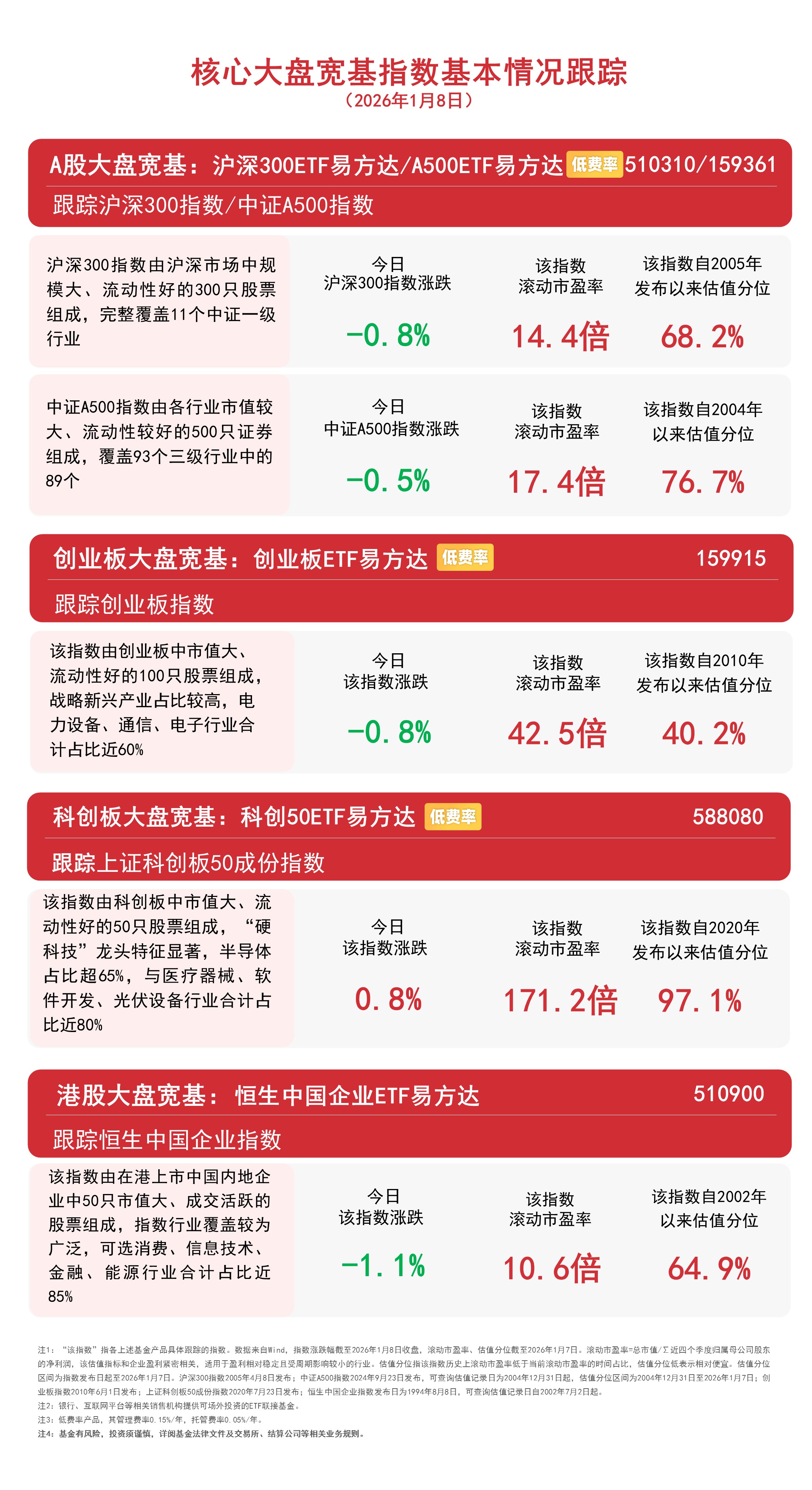 1月8日,A股三大指数集体震荡,全市场成交额约2.83万亿元,连续3日超2.8万亿元,超3700只个股飘红,超百股涨停,板块题材上,军工装备、商业航天、脑机接口、光伏设备、可控核聚变、AI智能体、房地产、量子科技、CRO概念股涨幅居前,保险、证券、有色金属、稀土永磁、银行、电池板块表现落后;港股全线回调,科技股延续调整,能源股逆势上涨。截至收盘,中证A500指数下跌0.5%,沪深300指数、创业板指数均下跌0.8%,上证科创板50成份指数上涨0.8%,恒生中国企业指数下跌1.1%。