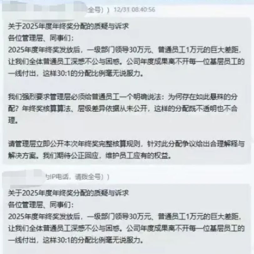 刘凯日前在公司内部群上发的信息 图片来自:网络 今日,每经记者和网传视频中的被打一方刘凯取得了联系。刘凯向记者详细还原了事件始末。他透露,申万期货的年终奖原本由三部分构成:每个季度预留的20%绩效、四季度绩效及年终专项奖励,公司过去都会在当年12月31日发放当年年终奖,他自2021年入职3年一直如此。但2024年公司突然停发年终奖,仅在2025年2月补发了9000元“过节费”;2025年12月31日发放的年终奖,他仅拿到1万元,而2023年同期发放金额为5万元,缩水近八成。此外,公司每年获评期货双A评级后都会发放的1万元专项奖励,2025年也未兑现。 “我们普通员工平时每个月到手工资只有几千块,在上海根本不够生活,全靠年终奖补贴家用。”刘凯表示,2024年公司董事长换届,当年停发年终奖时,公司管理层给出的理由是“中投公司有新规定,奖金发放不得超过公司利润的6%,未发的奖金公司会为大家争取”,但一年过去,公司2024年的年终奖励依旧没有落实,2025年的奖励也遭到了大幅度的削减,与公司近年来较为稳定的经营业绩形成了鲜明的反差。 让刘凯及同事感到不公的还有薪酬分配的悬殊差距。“我在公司内部群里发帖,是想向公司管理层求证,想让管理层公开年终奖核算规则和层级差异依据,结果当天企业微信账号就被全部关闭。”刘凯说,为了进一步沟通,日前他开直播前往总经理办公室,期间总经理陆三江要求关闭直播遭拒后,动手将他推倒,导致脸部软组织挫伤、头部外伤,经医院诊断为轻微伤。 更让刘凯气愤的是,1月5日节后第一天,他到公司上班时被通知停职,当天在前往公司沟通停职事宜时,又被几名保安推倒,导致手腕挫伤,两次受伤他均已报警,警方均已立案。