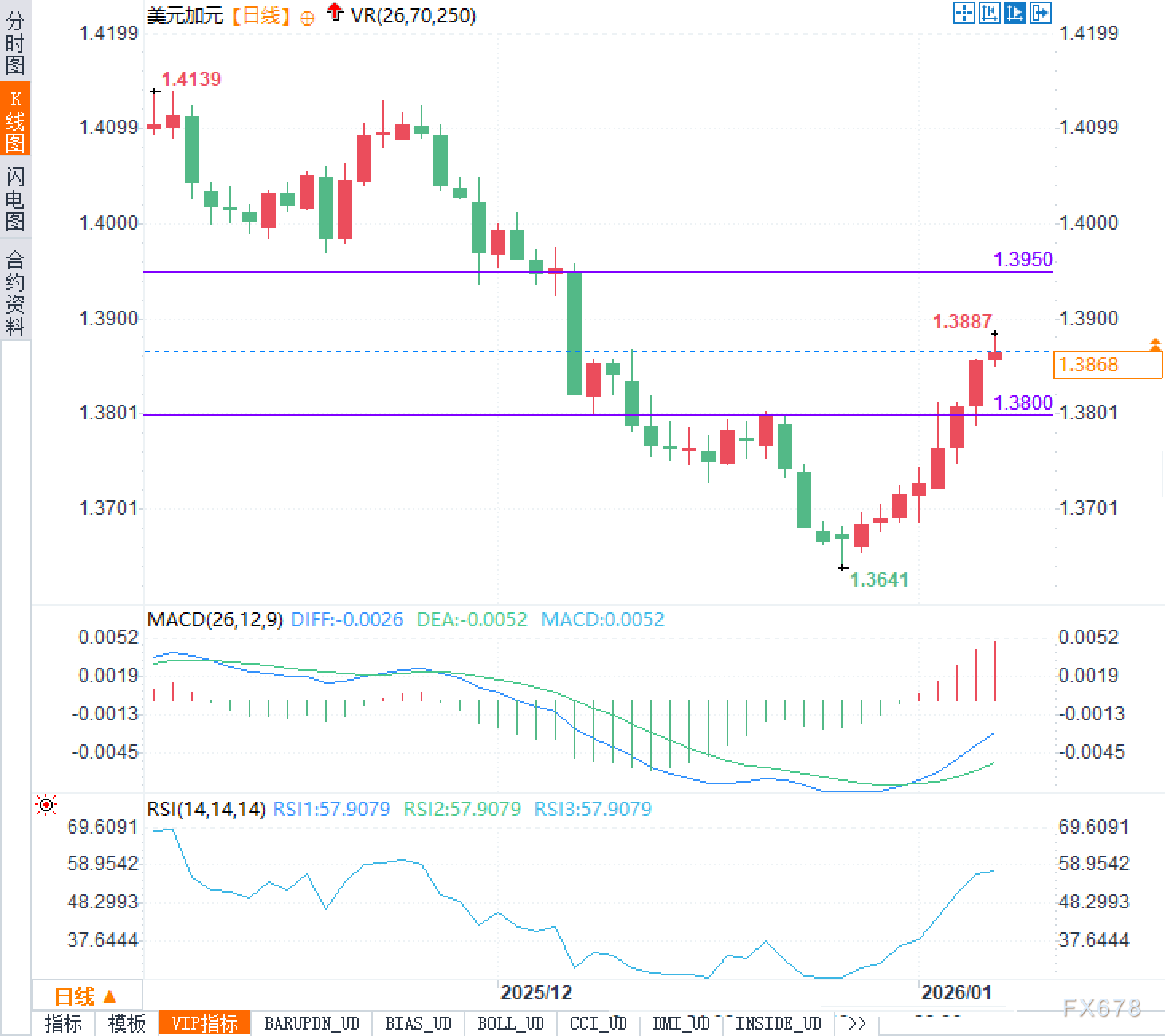 0周四(1月8日),美元兑加元汇价欧洲时段围绕1.3870附近运行。日线结构上,前期从1.4139一线高位回落后曾下探至1.3641,近期出现连续反弹并重新站上1.3800一线,短线多空开始围绕1.3800至1.3950区间展开再定价,事 ...