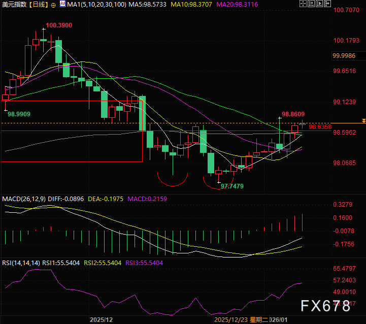 近期美债买盘的增多辐射到了美元,面对美国不断加码的地缘政治敞口,市场趋向于配置更多的美元和美债来做出应对。 ![]() 疲软的经济数据(包括仅新增4.1万个就业岗位的ADP就业数据),显著限制了美元指数的上行动能,从数据的角度多头缺乏持续上涨的基本面逻辑。 职位空缺与劳动力流动调查(JOLTS)数据显示,职位空缺数量降至714.6万个,低于市场预期,这一前瞻性指标明确信号劳动力需求正在持续降温。 美国供应管理协会(ISM)服务业采购经理人指数(PMI)升至54.4,显示服务业领域具备一定韧性,但这一局部亮点不足以抵消劳动力市场整体疲软带来的负面冲击。 好消息是美国12月挑战者企业就业数据显示,12月招聘人数为2022年以来最高。自1989年以来,2025年的裁员幅度居第7,美国12月挑战者企业裁员人数3.5553万人,前值7.1321万人 美国挑战者公司首席营收官AndyChallenger:年底宣布的裁员计划是2025年最少的。虽然12月的裁员通常是缓慢的,但加上更多的招聘计划,这是一个积极的信号。 但坏消息是一个月招聘,裁员数据完全无法逆转全年大规模裁员以及招聘缩减的趋势。 同时美国发布的初请和续请失业金数据,作为非农前的重要前瞻数据也显示出矛盾与纠结,两个数据均较上周有所增加,同时初请低于预期,续请高于预期暗示了裁员在减缓但是工作也不好找,并没有明显的方向性。 市场情绪与美元指数稳定性 美元指数在98.50上方维持窄幅震荡,反映的是市场的谨慎预期而非美元具备持续强势的基本面支撑。 10年期三十年期美债与美元一起走高暗示了市场资金的避险需求,美国增加军费支出,绑架委内瑞拉国总统,同时挑起类似格陵兰岛的地缘政治争议。 投资者出于避险以及不确定性选择持仓观望,尤其是在非农就业报告这一高影响力数据临近的背景下,多数交易员倾向于等待明确信号再布局。 当前经济放缓担忧与美元避险属性之间的脆弱平衡,即便地缘政治是近期交易的核心吗,但随时向上的动能也可能因劳动力市场数据的低于预期表现而被打破。 非农就业报告与美联储政策预期 市场普遍预期非农就业报告将显示就业岗位新增数量放缓至约5.5万个,较前一月的6.4万个进一步回落,就业市场扩张动能持续减弱。 若非农就业报告表现不及预期(新增岗位低于5万或失业率超预期上行),将直接推升市场对美联储激进降息的押注,给美元带来显著下行压力,甚至可能触发DXY跌破98.50关键支撑位。 包括斯蒂芬·米兰、尼尔·卡什卡里在内的美联储官员已释放出更关注经济增长的鸽派信号,这进一步强化了市场对宽松货币政策的定价,为美元中期走弱埋下伏笔。 结论与技术分析: 美元指数当前处境脆弱,劳动力市场疲软是其面临的核心下行风险,基本面支撑逻辑持续弱化。 若特朗普继续释放地缘政治加码信号,则美元依然有继续走强的可能。 此外各路就业数据偏弱,初请、续请、挑战者数据无法提供明确的方向,一切还是要看非农就业报告,如果非农数据表现令人失望,失业率超预期上升,可能会推动美元指数跌破98.63支撑位,回到看跌区间,下一个支撑在98.10附近,反之美元指数则可以与地缘政治一同作用维持强势的反弹格局。 技术面,美元指数涨过98.63后看见了持续反弹的影子,98.90是上方关键压力位,如果能涨过98.90并且稳住,则反弹格局将可以确立,美元指数重新开始走强。 ![]() 北京时间21:55,美元指数现报98.88。