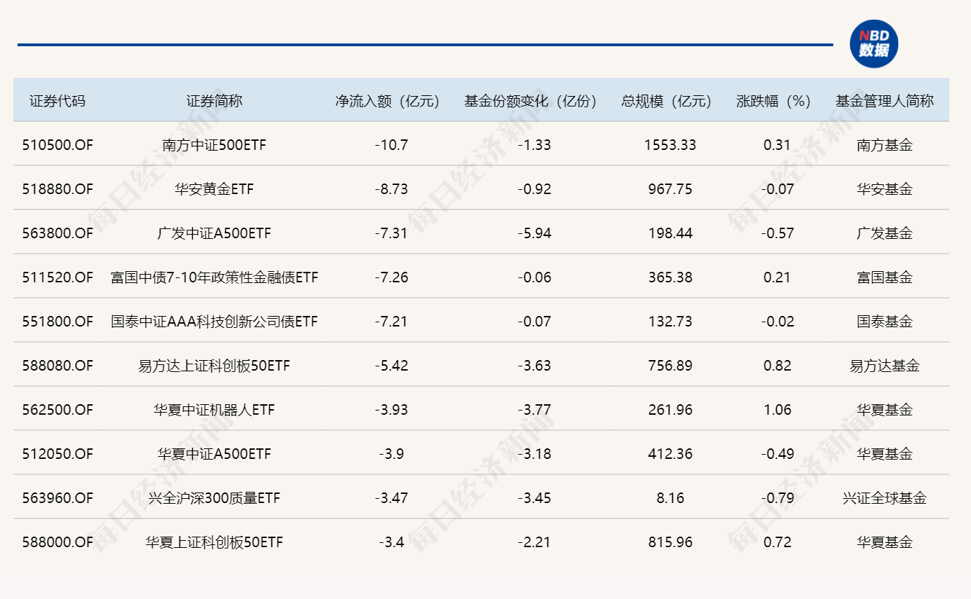 每经记者|肖芮冬 每经编辑|赵云 昨日沪指窄幅震荡,创业板指盘中跌超1%。板块来看,商业航天、脑机接口、可控核聚变、AI应用等概念走强;大金融、稀土永磁、有色金属等板块跌幅居前。 Wind数据显示,在1月8日的非货币ETF市场中,国泰中证全指证券公司ETF份额增加9.11亿份,净流入额11.28亿元;华夏恒生科技ETF份额增加14.62亿份,净流入额11.01亿元;华夏中证细分有色金属产业ETF份额增加5.12亿份,净流入额10.35亿元。