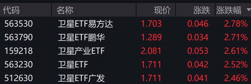 每经记者|叶峰 每经编辑|肖芮冬 卫星概念股早盘走强,航天电子涨超9%,臻镭科技涨超7%,中国卫通涨超4%。 受盘面影响,卫星相关ETF涨超2%。