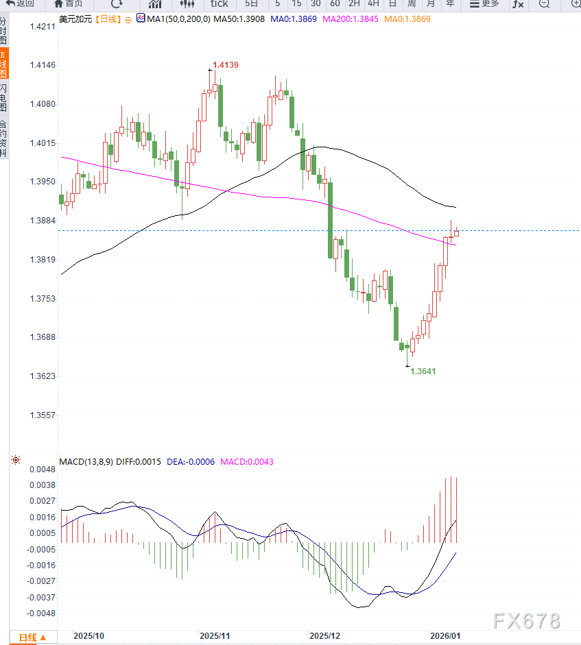 周五亚洲交易时段,美元兑加元交投坚挺,接近月内高点1.3888。交易员在美国与加拿大即将公布的就业数据前,普遍采取观望态度,短线方向性交易有所收敛。 ![]() 加拿大方面,市场预计12月就业岗位将净减少约5千个,此前11月新增岗位为5.36万个,显示劳动力市场降温迹象。 失业率可能从6.5%升至6.6%。若数据确认就业降温,加拿大央行可能在短期内重新评估货币政策前景,增加市场对未来宽松预期的押注,从而对加元形成压力。 综合来看,美国经济数据偏温和但整体支撑美元,加拿大就业降温的预期则增加加元承压概率,使美元兑加元维持强势格局。 从日线图形来看,美元兑加元维持上行结构,价格逼近1.3888月内高位,显示多头动能仍然充足。技术指标显示: 200日EMA位于1.3780附近,价格维持在均线上方,上行趋势未受破坏,回调仍有支撑。 MACD快线在零轴上方保持金叉状态,红柱略有扩张,显示短中期多头动能偏强。 RSI约为61,处于中性偏强区间,未进入超买状态,短线仍有延续上涨空间。 若美元兑加元稳步突破1.3888阻力并站稳,可能打开进一步上行空间;下方支撑位于1.3820–1.3800区域,一旦失守,短线回调风险将上升。 ![]() 美元兑加元当前受益于美元偏强及加拿大就业降温预期的双重支撑。短线汇价可能维持高位震荡,非农数据公布前操作需谨慎。若美国非农数据表现偏弱,美联储宽松预期可能进一步支撑美元; 若数据强劲,加元承压压力或加大,汇价有望进一步测试月内高点。