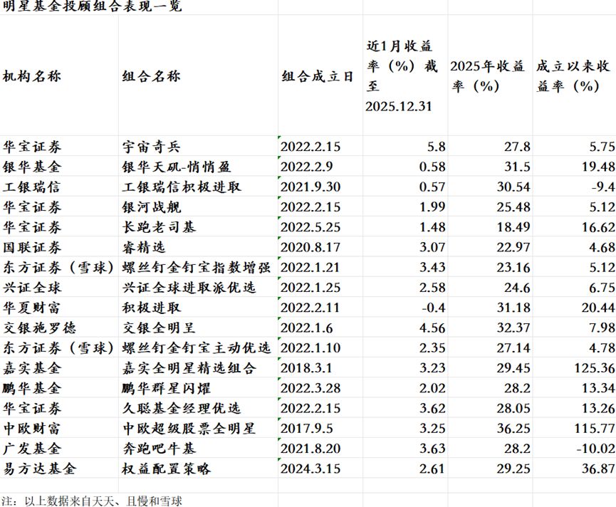 每经记者|李娜 每经编辑|赵云 2025年,基金投顾业务在政策有力支持与市场深度演进下迎来规模与质量的双重提升。 数据显示,全年主投A股的明星投顾组合平均收益率接近28%,全球配置组合亦全部实现正收益。与此同时,机构的积极调仓与多元策略布局,共同勾勒出行业从“卖方销售”向“买方投顾”深化转型的年度图景。 明星组合平均收益近28%2025年权益市场行情下,主投A股的明星投顾组合交出亮眼答卷。据《每日经济新闻》记者统计,纳入统计的17只明星投顾组合整体表现稳健,年度平均收益率为27.92%。 数据显示,2025年收益前三甲均实现30%以上的收益率。中欧财富旗下的中欧超级股票全明星组合以36.25%的收益率登顶,交银施罗德旗下的交银全明星组合紧随其后,年度收益率32.37%,银华基金推出的银华天玑-悄悄盈组合则以31.5%的收益率位列第三,此外,2025年度收益率突破30%的投顾组合共5只,除上述前三名外,还包括华夏财富的积极进取组合,工银瑞信积极进取组合,年度收益率分别为31.18%、30.54%。