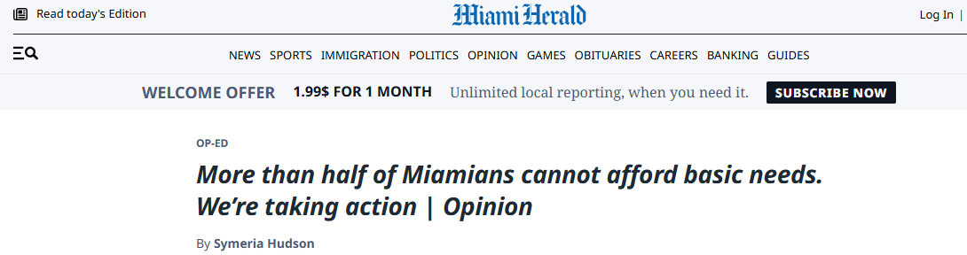 美国《迈阿密先驱报》网站报道截图 文章表示,在迈阿密,现实令人清醒:戴德县超过五十万个家庭难以负担住房、食品、医疗、托儿、交通和技术等必需品和服务。家庭收入与实际生活成本之间的差距持续扩大。西默里亚·哈德森在文中强调,这些挑战并非抽象概念。当家庭被迫在支付房租和喂养孩子之间作出选择时,这并非个人失败,而是系统性问题。这需要企业领导者、政策制定者、教育者、医疗系统、非营利组织和普通公民共同努力。 来源 | 总台环球资讯 编译 | 杜慧琴 签审 | 闫明 监制 | 蔡耀远 |