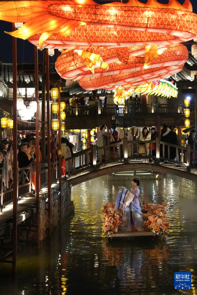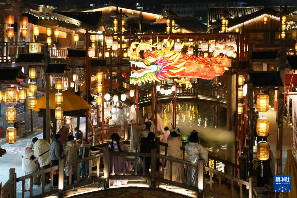 1月9日,游客在南岳里赏景游玩。新华社记者 陈振海 摄 南岳里位于湖南省衡阳市南岳区,北望衡山,是以“庙会民俗”为主题的美食文化街区,集餐饮、住宿、旅拍、演出等消费业态于一体,为游客提供多元体验。近年来,当地挖掘历史文化底蕴,通过打造夜间消费新场景、新业态,推动夜经济发展。