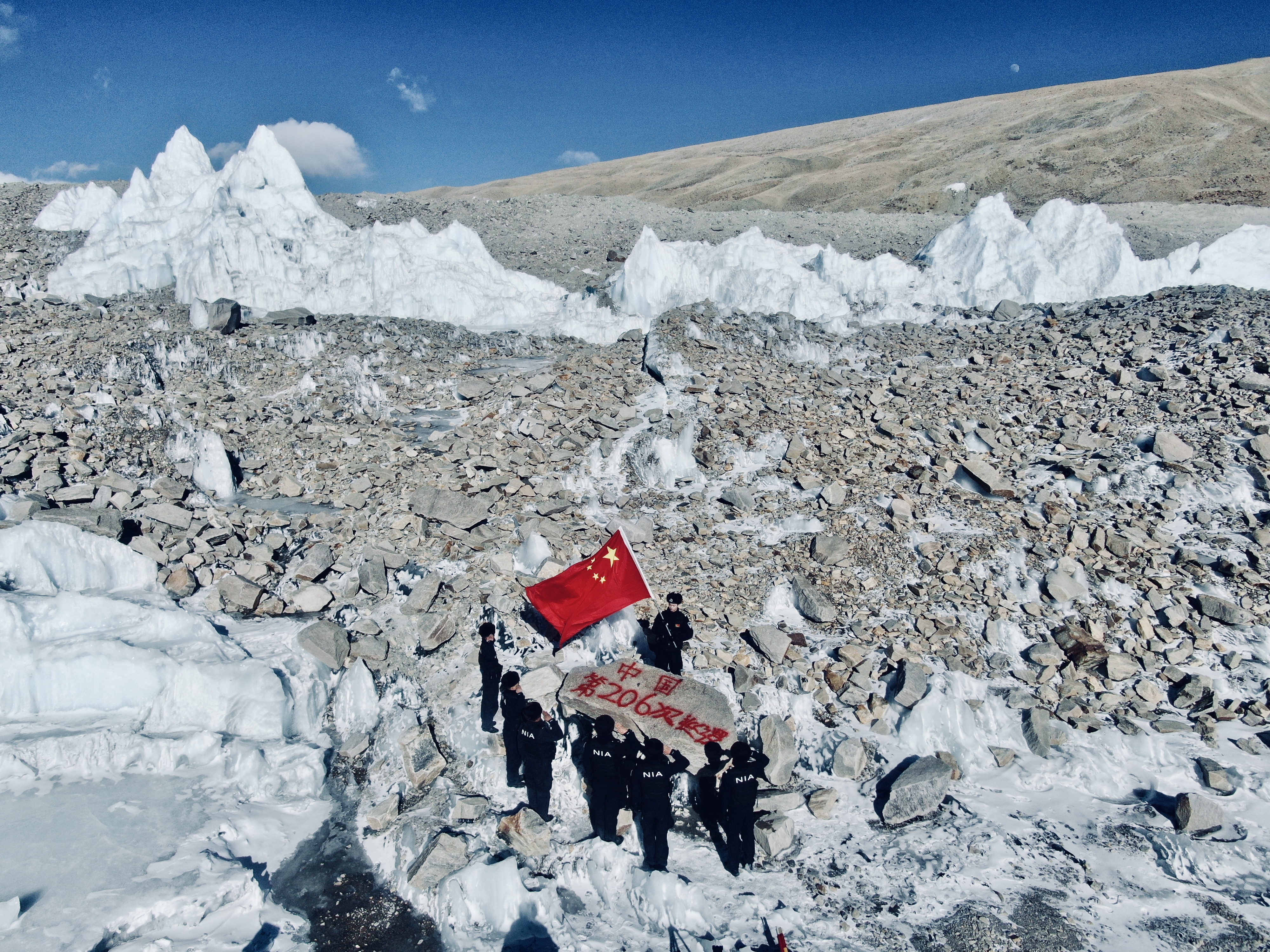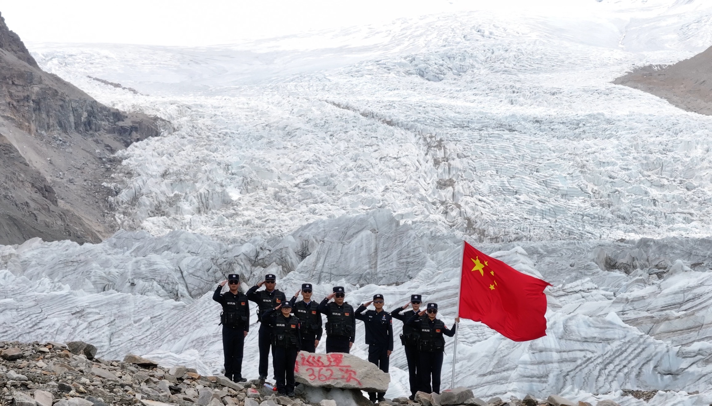 普玛江塘边境派出所民警在辖区巡逻途中描绘“中国”字样 每天清晨6点,3人准时起床,在严重缺氧的环境中完成内务整理和巡逻准备。冬季室外温度低至零下20度以下,积雪深达1米,寒风呼啸着能把人吹倒,她们背着10公斤的装备徒步巡查边境线,每一步都像踩在棉花上。去年7月,她们接到游客报警,有车辆和人员被困前往岗布冰川的无人区,在零下20度的寒风中搜寻了5小时,最终成功解救遇险者。在巡逻中不边境海拔达5600米的岗布冰川时,她们必须用绳索将彼此相连,在冰峰与裂缝间艰难前行,并在冰川旁的石头上用油漆喷绘"中国"字样,让红色的光芒在风雪中闪耀。