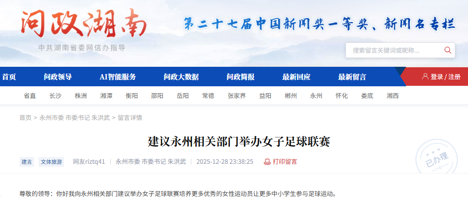 网友在《问政湖南》栏目上的发帖内容与官方回应。 红网时刻新闻1月12日讯(记者 陈星晓)近日,有网友在红网《问政湖南》栏目建议永州市相关部门举办女子足球联赛,以培养更多优秀女性运动员,并推动中小学生参与足球运动。该建议获得永州市文化旅游广电体育局的公开回应。 网友在建议中表示,希望永州通过举办女子足球联赛,加强女性足球人才培养,吸引更多中小学生投身足球运动,促进青少年体育发展。 对此,永州市文化旅游广电体育局回应称,近年来永州已持续夯实校园足球基础,推动青少年足球赛事常态化开展,并涌现出部分优秀女足后备人才。针对举办女子足球联赛的建议,该局表示将结合永州足球运动发展实际,统筹教育、体育等相关部门力量,积极调研论证举办市级女子足球联赛的可行性与实施方案。 回应中还提到,永州将进一步探索校园足球人才培养路径,努力推动足球事业持续健康发展。 延伸阅读: 2025年,永州足球队在湖南湘超联赛中成功夺冠。夺冠后,江苏网友为永州捐赠的“这里是永州,我们是冠军”广告牌掀起全网第二波热度,更点燃了全国网友尤其是江苏网友赴永热潮。永州文旅部门也通过免费开放38处景区、寄送道州脐橙、江永香柚等方式回应江苏网友的善意,实现了“双向奔赴”。 2026年1月18日至24日,由中央广播电视总台组织的CMG群众足球邀请赛首站比赛将在永州举行,湘超冠军永州队将作为东道主迎战来自全国的多支队伍,在为期七天的赛程中,共将上演九场精彩对决。