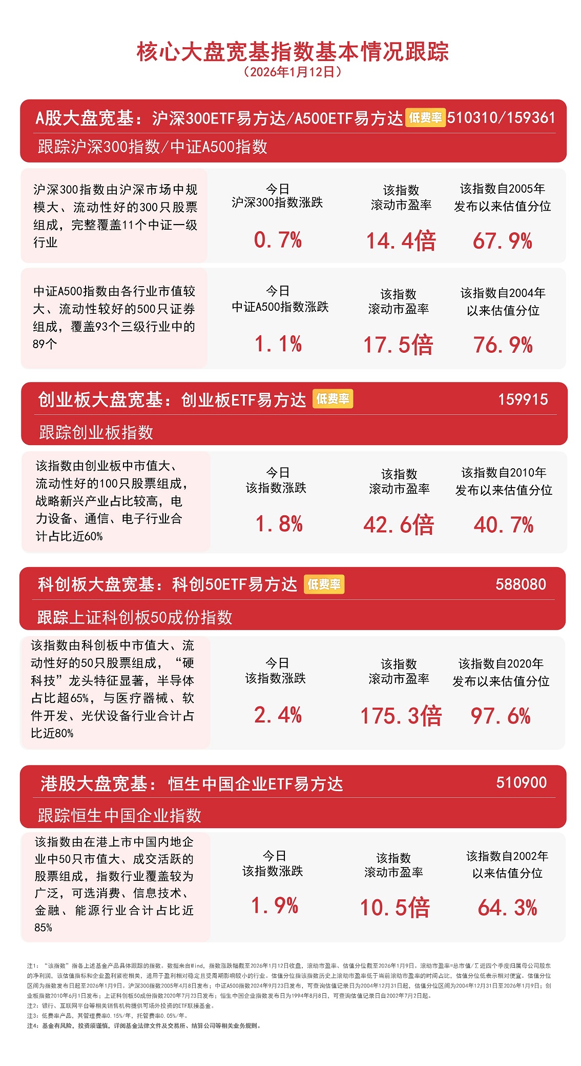 1月12日,A股市场持续走强,沪指高开高走涨超1%,实现17连阳,再度刷新近10年新高,全市场成交额超3.6万亿元、创下历史新高,较上一交易日放量约5000亿元。盘面上,AI应用题材全线爆发,商业航天掀涨停潮,核聚变、零售、半导体概念股表现活跃。港股整体走强,AI产业链股涨幅居前。 截至收盘,中证A500指数上涨1.1%,沪深300指数上涨0.7%,创业板指数上涨1.8%,上证科创板50成份指数上涨2.4%,恒生中国企业指数上涨1.9%。