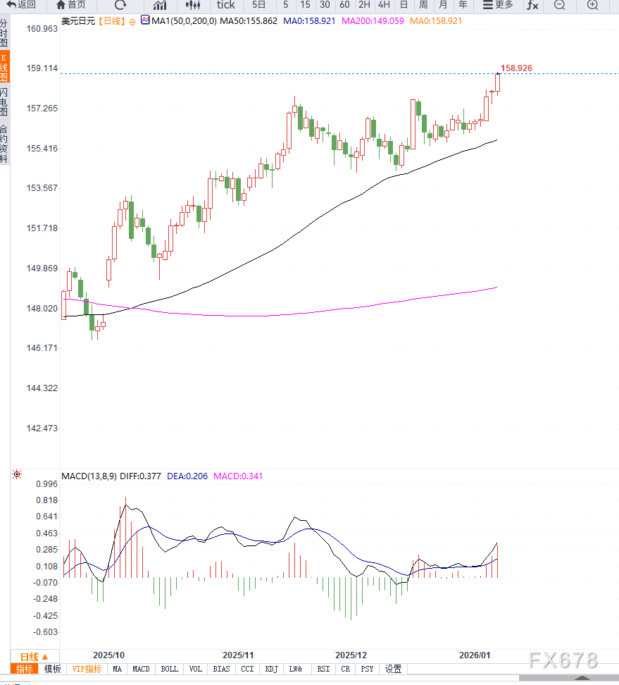 周二亚洲时段,美元兑日元持续上行,触及159.00附近,为自2024年7月以来最高水平。日本首相高市早苗可能在2月上旬提前大选的消息,加剧了市场对更多扩张性财政政策的预期。 ![]() 投资者也在等待美国12月消费者通胀数据,以获取美联储未来降息路径的最新信号,这将对美元兑日元近期走势产生关键影响。 日本财政大臣表示,已向美国财政部长表达对日元单边下跌的关注,并强调容忍贬值的空间有限。 市场对美联储可能在2026年进行两次降息的预期,与日本央行继续维持政策正常化形成显著分歧,也在一定程度上限制美元兑日元进一步上行空间。 日本央行行长表示,只要经济和物价走势符合预期,将继续加息,政策紧缩的可能性仍在。 从日线图形来看,美元兑日元维持明确的多头格局。K线连续收出中长阳线,上行势头稳健。50日简单均线(SMA)持续上行,价格稳守均线之上,均线约在156.00附近,为近期拉升提供动态支撑。 MACD指标在零轴附近形成金叉,柱状图转正,显示动能改善。RSI为67.47,虽强势但未进入超买区,为汇价上行留有空间。 日线级别只要保持在上升SMA之上,回调将受控,进一步上攻158.00甚至159.50存在可能;若收盘跌破均线,多头动能或减弱,进入整理阶段。 在4小时图形上,汇价呈短期上行趋势。价格维持在短期均线与中期均线之上,均线呈多头排列,支撑较为稳固。MACD在零轴上方持续金叉,柱状图保持正值,动能保持上升趋势。 KDJ指标位于高位运行但未完全钝化,短线仍有进一步上行动能。4小时级别显示汇价可能在158.50–159.50区间内延续震荡上行,等待新的政策或数据信号触发方向性突破。 ![]() 美元兑日元的短期强势主要由日元避险需求下降及日本政治预期推动,技术面显示多头趋势稳固。虽然日本当局可能通过口头干预遏制日元贬值,但短期市场仍倾向美元上行。 关键关注点包括美国即将公布的通胀数据,以及日本政策动态,这些因素将决定美元兑日元是否能够延续高位突破或进入区间震荡。