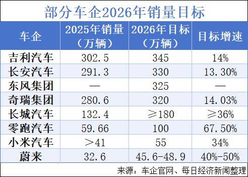 2026年车市大幕拉开,多家主流车企陆续公布年度销量目标。 据《每日经济新闻》记者观察,2026年,传统汽车集团普遍坚持稳健增长策略,将新能源业务的深化转型与海外市场的版图扩张列为核心发力点;而造车新势力及跨界入局的科技企业,则凭借2025年的高速交付势头与产品口碑积累,纷纷设定大幅超越行业平均增速的激进目标,力求在智能电动赛道抢占更多市场份额。 传统车企稳增长,目标增速10%至15% 综合来看,多家传统汽车集团基于2025年市场表现,普遍设定了10%至15%的同比增长目标,同时将新能源业务作为销量提升的关键引擎,通过产品矩阵扩容与品牌细分巩固市场地位。 具体来看,吉利汽车延续增长势头,在2025年超额完成300万辆目标后,将2026年销量目标定为345万辆,同比增长约14%,目标绝对值位居行业前列。其中,吉利品牌承担275万辆销量,极氪与领克分别瞄准30万辆和40万辆。新能源业务成为吉利汽车的重中之重,2026年新能源销量目标达222万辆,同比增长32%,新能源渗透率将从2025年的55.8%提升至64.3%,凸显向新能源全面转型的决心。 长安汽车2026年计划销售330万辆,同比增长13.3%,其中新能源销售目标140万辆,同比增长26.2%;海外市场目标75万辆,同比增长17.7%。此前,长安汽车(000625)拟定了“两个100万辆”目标,即新能源车和海外出口销量均为100万辆。 奇瑞集团则以320万辆为销售目标,较2025年280.6万辆的销售成绩同比增长14.03%。 “2025年,在新能源领域,奇瑞集团实现了跨越式增长,全年销售新能源车903847辆,同比增长54.9%,上市的全新产品中新能源占比超90%;在智能化领域,猎鹰智能驾驶辅助实现广泛装车,推动高阶智驾平权;灵犀智舱持续进化,推出下一代旗舰座舱芯片、 AI智能体‘小奇同学’等。”奇瑞汽车股份有限公司执行副总裁李学用表示,2026年奇瑞集团计划推出17款重点车型,旗下五大品牌合力向电动化、智能化发起冲击,延续近年来稳步增长的态势。 东风集团与奇瑞集团目标相近,均瞄准320万辆级别市场。东风集团将2026年整体销量目标定为325万辆,其中新能源汽车170万辆、出口60万辆。这一目标建立在2025年新能源汽车和自主乘用车“双百万”销量目标达成的基础上,旗下岚图品牌2025年87%的同比增速也为其注入信心。2026年,东风集团将深化与华为的合作,并在技术上持续加码,包括发力混动技术和自主车规级芯片等。 长城汽车则采取相对审慎的策略,将2026年销量目标定为不低于180万辆。相较于2025年132.4万辆的实际销量,这一目标仍有显著的提升空间。其新能源业务占比不足三成的现状,意味着转型仍是其2026年的核心任务。