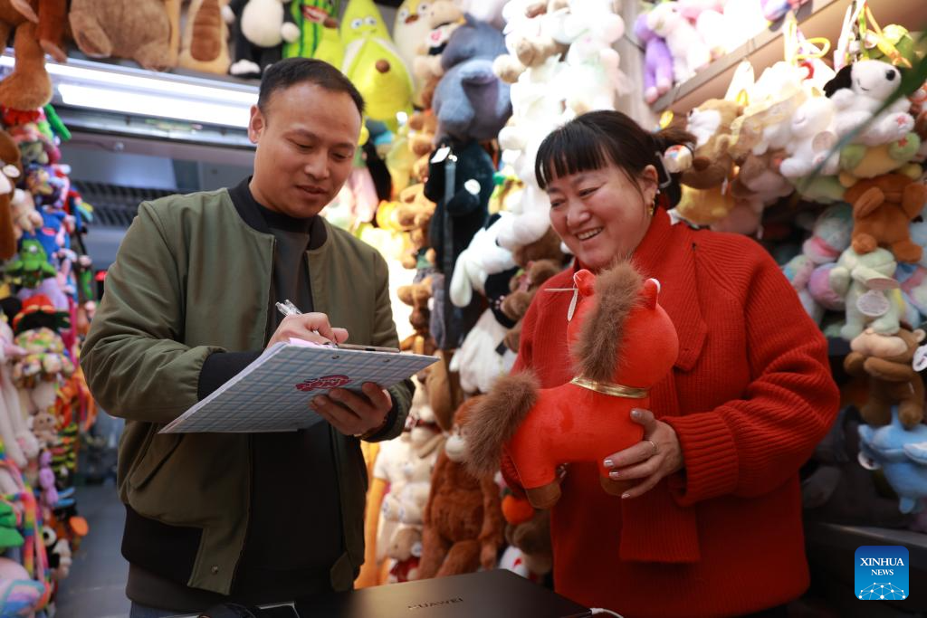 Zhang Huoqing, general manager of plush toy store Happy Sister, checks orders at the Yiwu International Trade City in Yiwu, east China's Zhejiang Province, Jan. 10, 2026. (Xinhua)