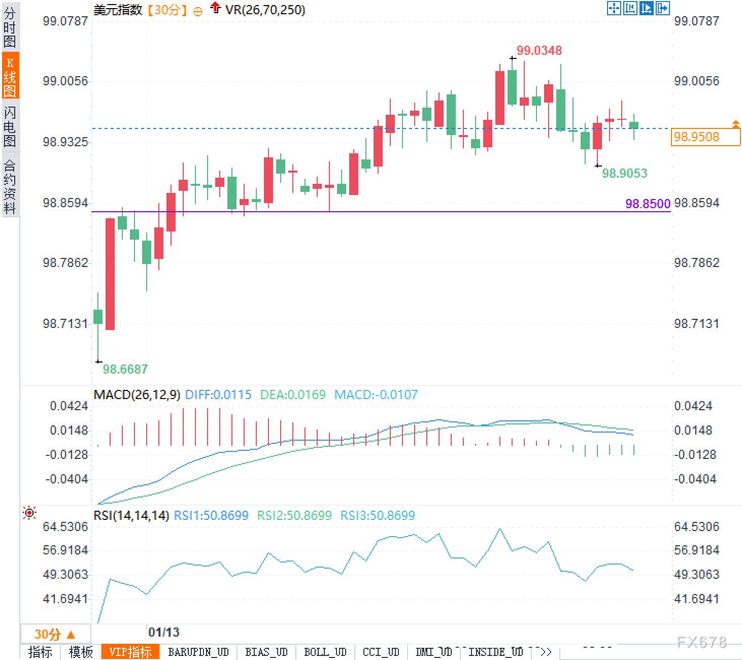 0周二(1月13日),美元指数欧洲时段围绕98.95附近窄幅震荡,走势显得犹豫不决。从技术图形看,价格曾在98.6687一线形成阶段性低点后展开反弹,一度冲高至99.0348,但后续动能明显减弱,未能站稳99关口,随即回落至 ...